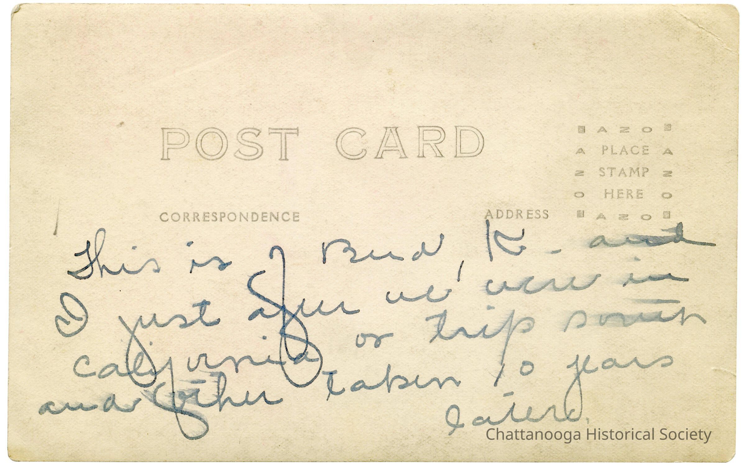 A gelatin-silver printed photographic postcard with the front showing a teenage boy, a man, and a woman sitting on Umbrella Rock. A sign at the bottom left describes The Battle of Wauhatchie that took place in the valley below.
