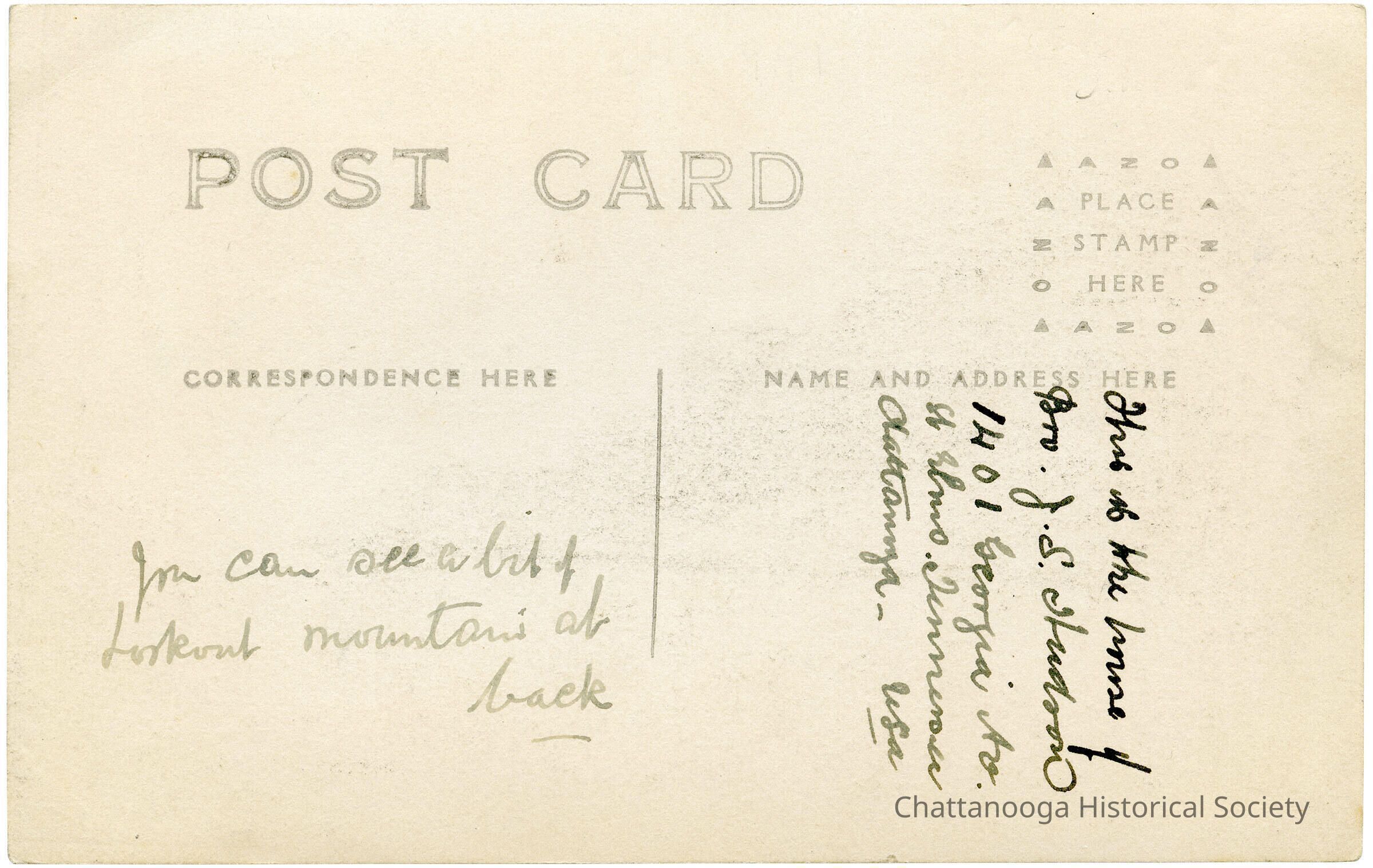 A postcard with the front showing a photograph of the home of Mr. J. S. Hudson at 1401 Georgia Street in the St. Elmo area of Chattanooga, Tennessee. The Folk Victorian House has an L-shaped floorpan with a front porch and front gable decoration. There are two women standing behind a picket fence in the front yard and a younger woman sitting on the porch. There is hand writing on the side of the card that reads "Mr. J. S Hudson's house, St. Elmo. Chattanooga. Ten."Subject Place