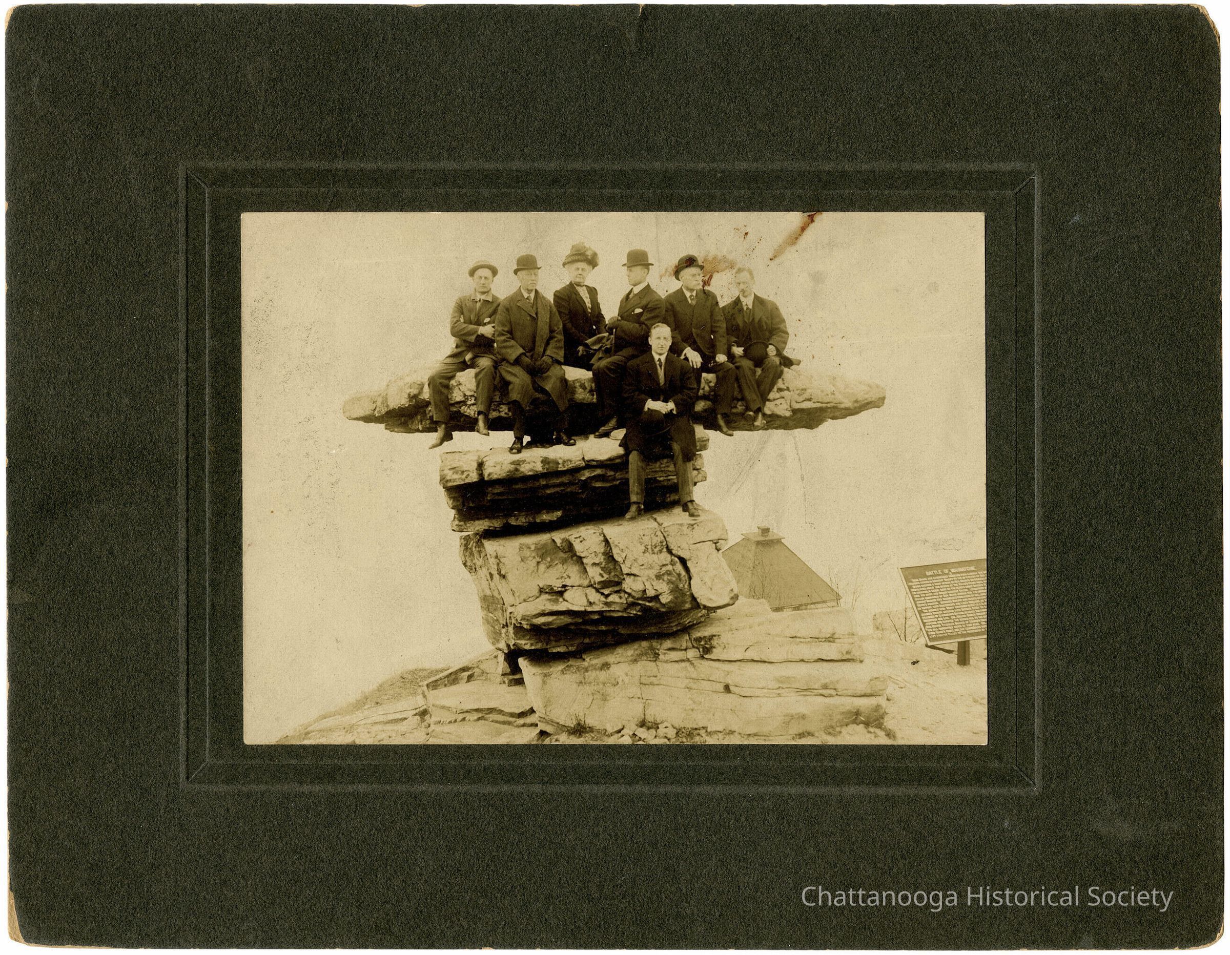 A cabinet card photograph showing six men and one woman sitting on Umbrella Rock atop Lookout Mountain, Tennessee. All but one man is sitting on the very top of the slab, with the woman sitting at center, top. They are all dressed in dark clothing. The roof of the Point Hotel can be seen behind the formation and the information signage for the Battle of Wauhatchie is to the right.