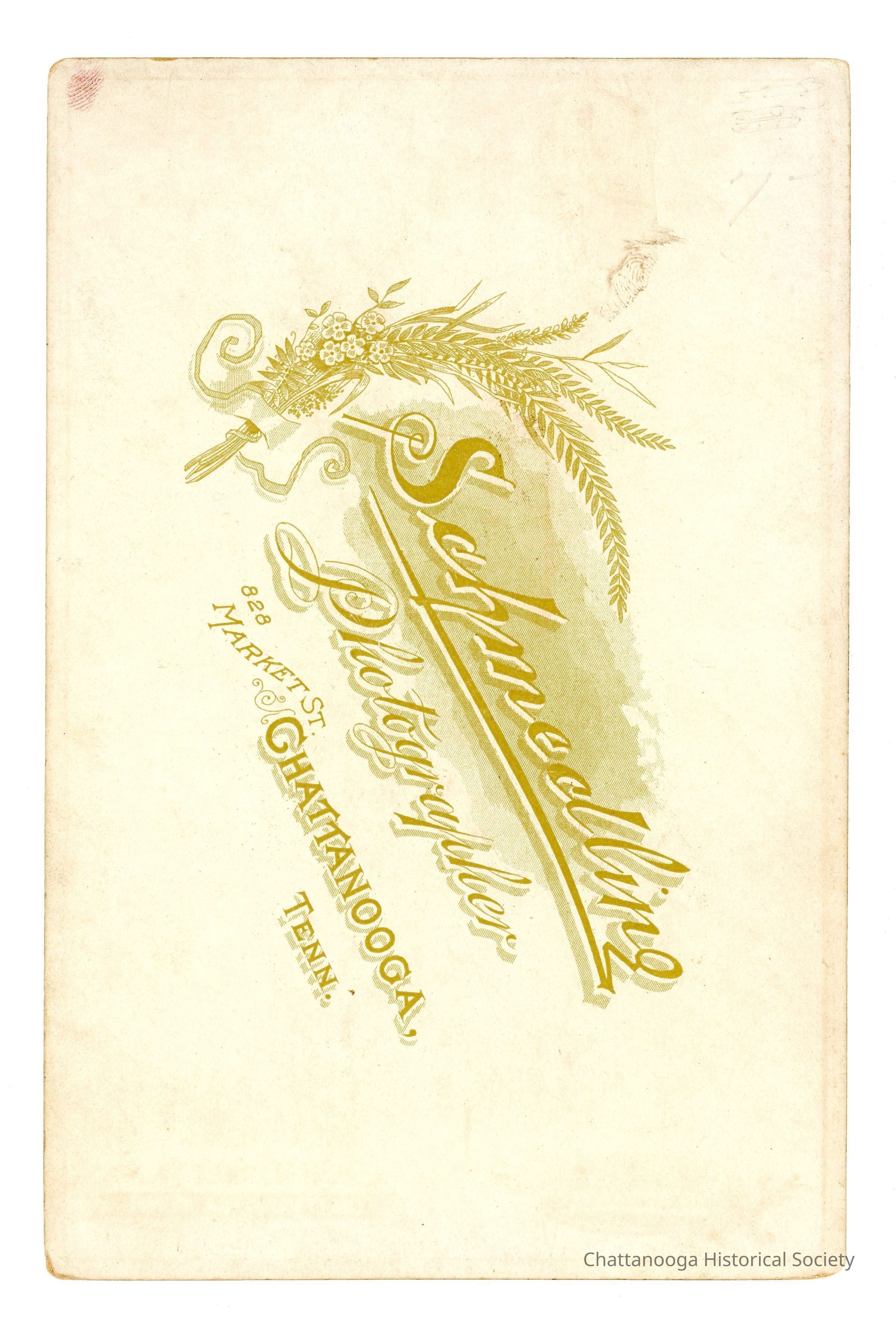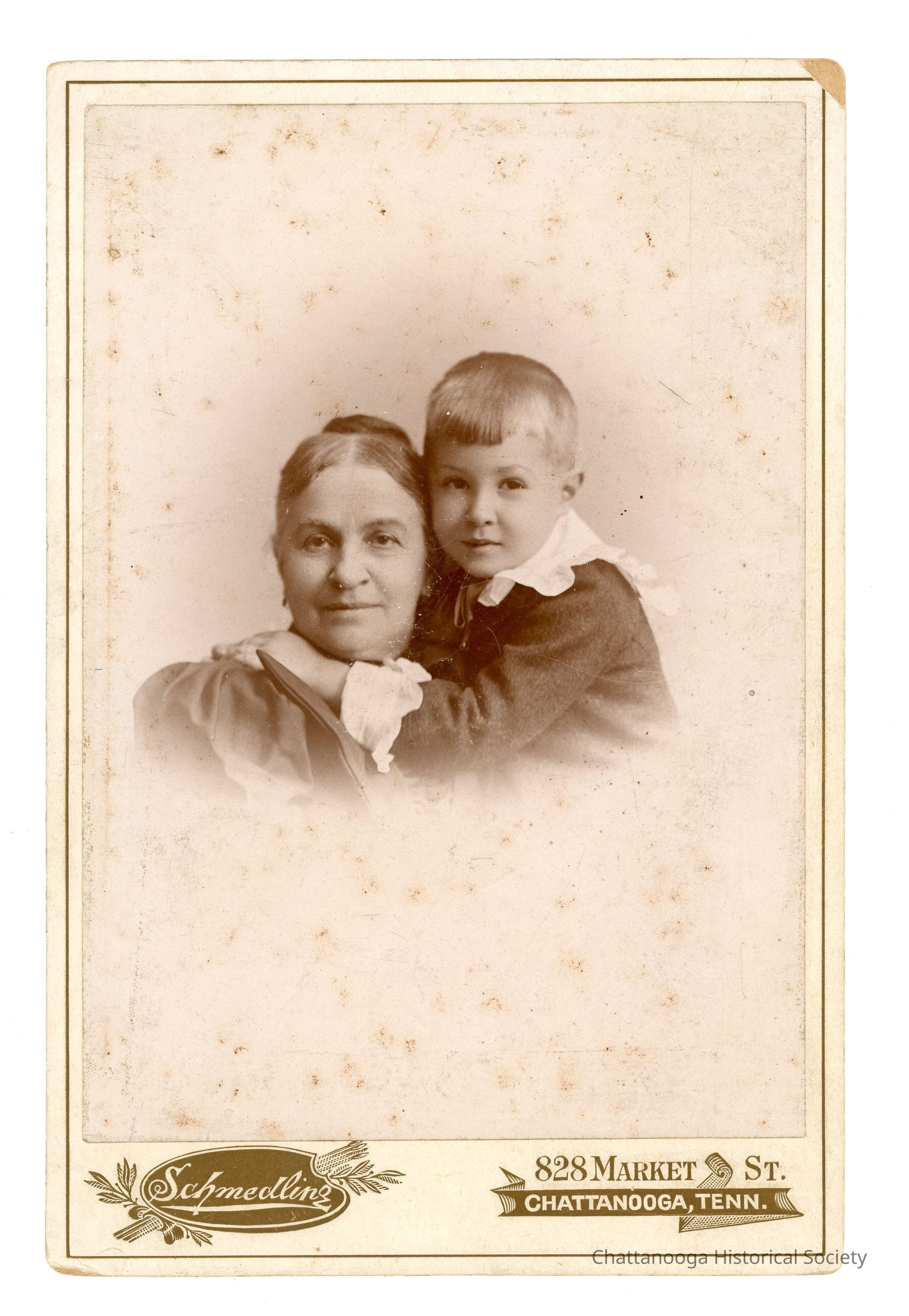Black and white cabinet card photograph of a woman and a young boy. The woman is seated, wearing a dark wool dress with mutton sleeves. A young boy is seated in her lap with his arms wrapped around her neck. The boy is wearing a wide white collar and lace cuffs. The photograph is marked at the bottom gutter "Schmedling" at left and "828 Market St. | Chattanooga, Tenn." at right.Photograph Details