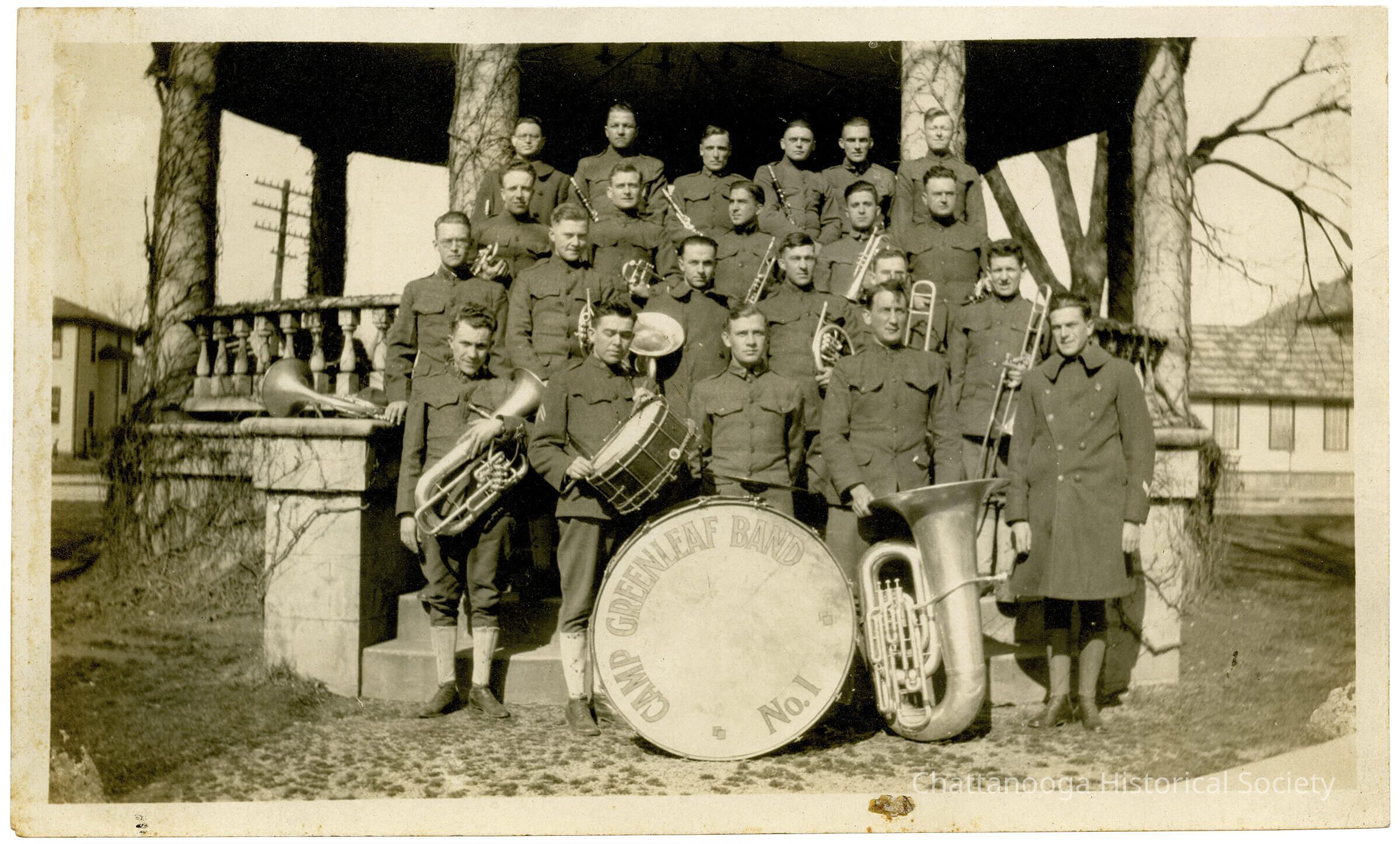 A photograph of the Camp Greenleaf Band No. 1 in front of a pavilion.The large drum at center reads "Camp Greenleaf Band No. 1" and the band members are posed around it on the steps of the pavilion, holding their instruments. They are wearing WWI era military uniformsPhotograph Details