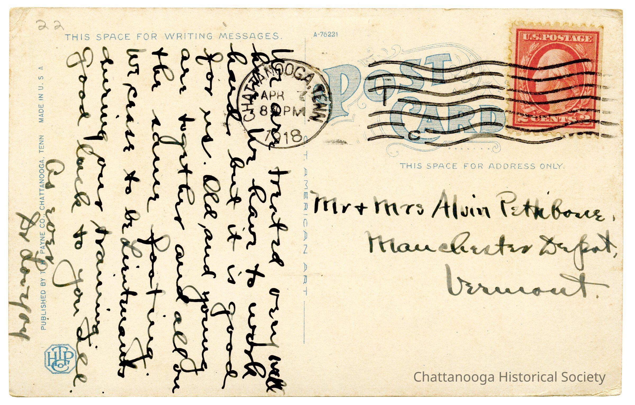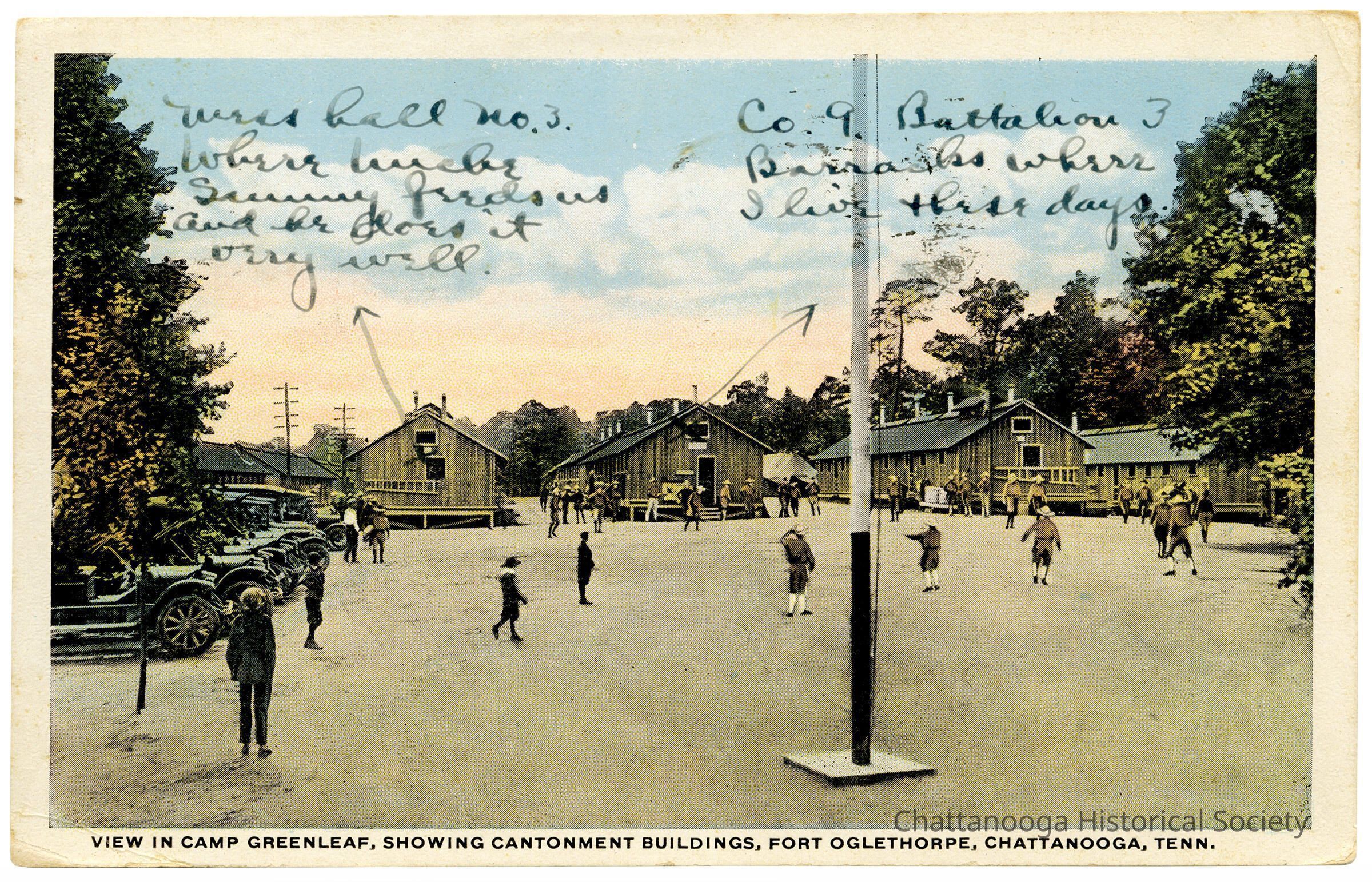 A postcard with the front showing cantonment buildings in Camp Greenleaf at Fort Oglethorpe, Georgia, during World War I. The postcard is labeled "View in Camp Greenleaf, showing Cantonment Buildings, Fort Oglethorpe, Chattanooga, Tenn.