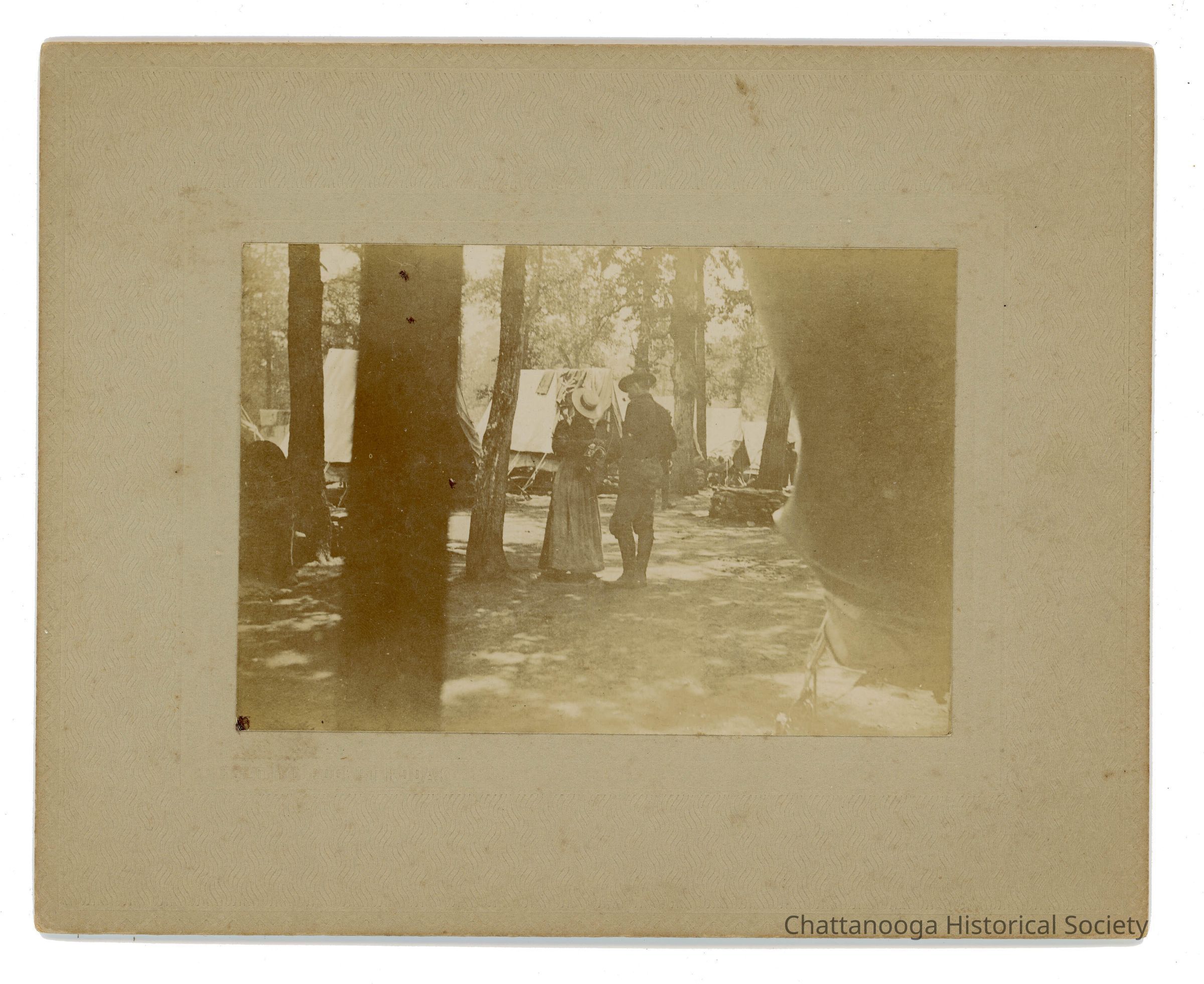 Black and white photograph mounted on textured cardstock featuring a washerwoman talking to a man partially in uniform at Camp Thomas. The woman, wearing a dark skirt and top with a straw boater-style hat, is facing a man wearing riding pants and a dark shirt and may be taking laundry from him. The photographer appears to be positioned inside of a tent and a number of tents can be seen in the background of the photograph. Circa 1898