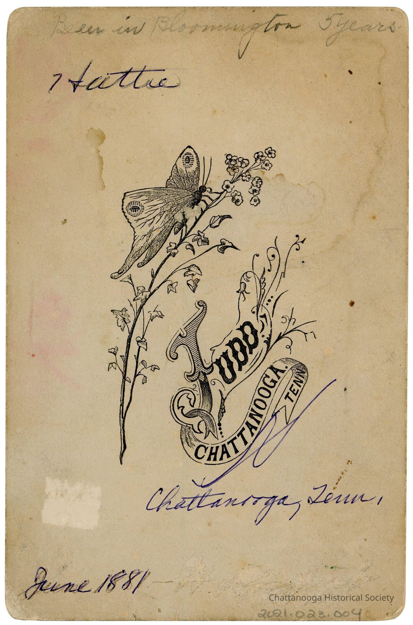 The rear of the card features the Judd logo with butterfly and ribbons. "Been in Bloomington 5 years" written in pencil at the top with "Hattie" written underneath. Underneath the Judd logo says "Chattanooga, Tenn," and "June 1881"Photograph Details