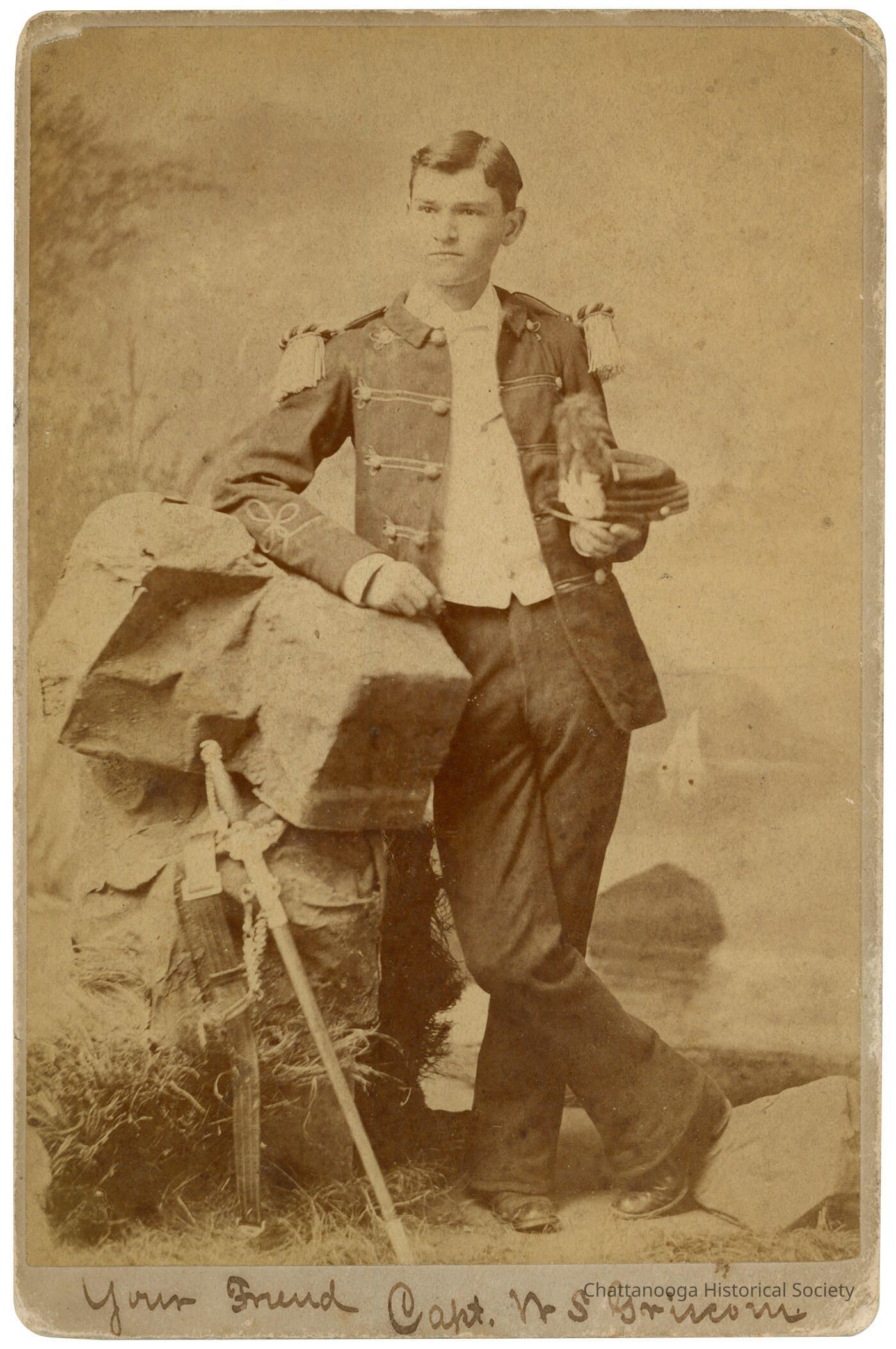 Cabinet card photograph of Captain [W]. S. Griscom taken by Amos W. Judd Studio. The young man is leaning up against a prop rock formation. There is a ceremonial sword leaning up against the rocks. The young man in wearing a militia - appearing uniform, including fancy epaulets with fringe and an open jacket with Captain sleeve ribbon. He is holding a kepi style hat with hackle.