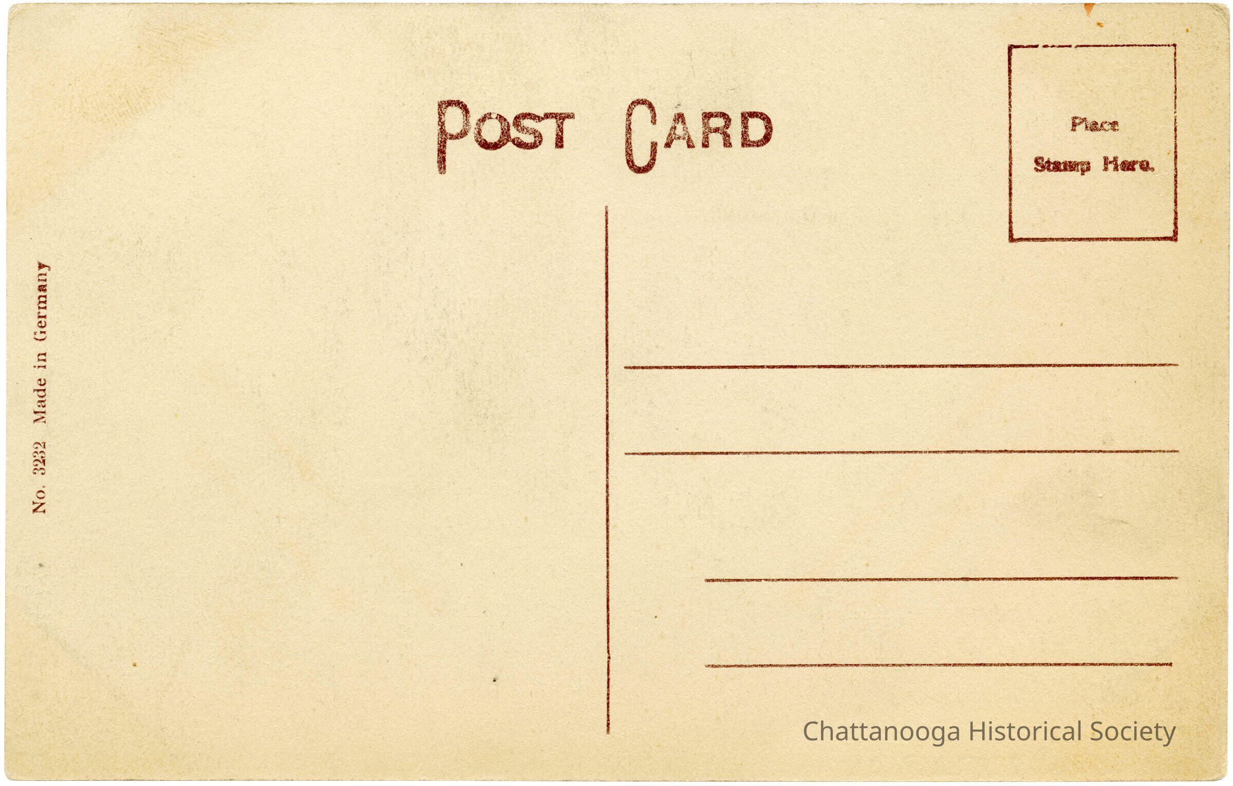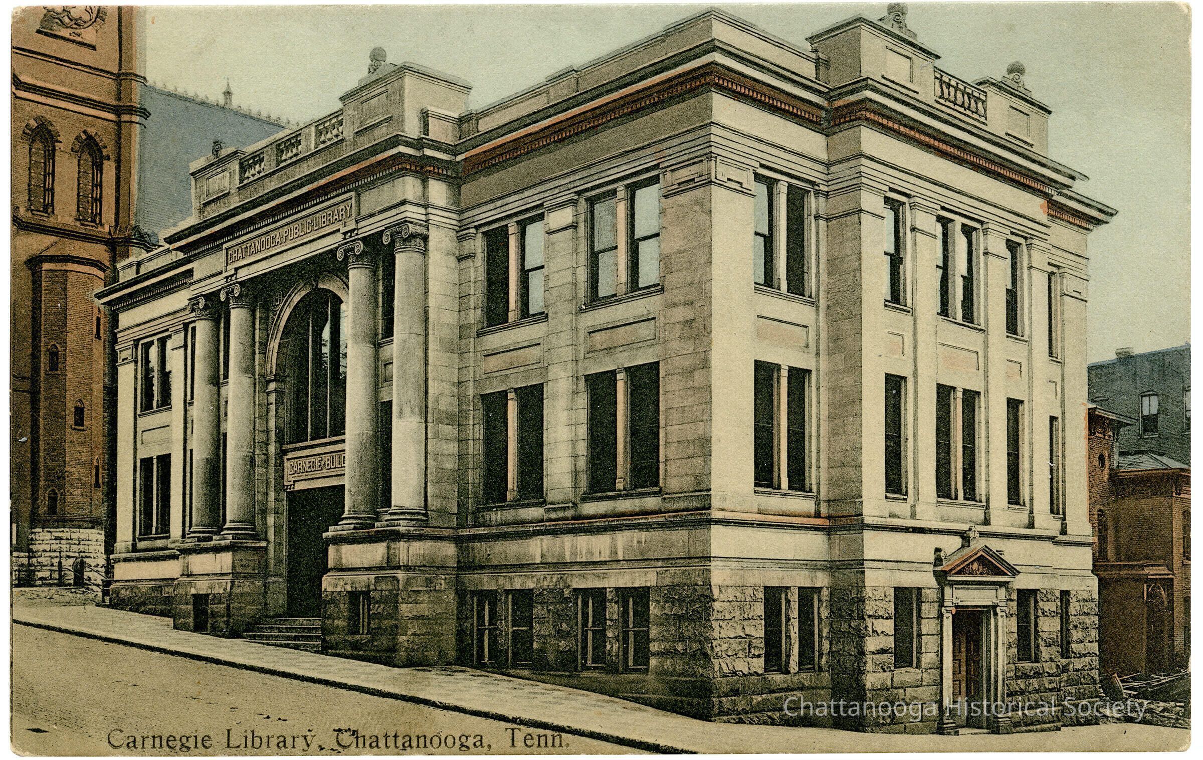A postcard with the front showing a color-tinted photograph of the Carnegie Library, built in 1904, at 200 E. 8th Street in Chattanooga, Tennessee. The view is of the front and side elevation the building, showing the ground floor rustication and the large paired column around the front entrance.Subject Place