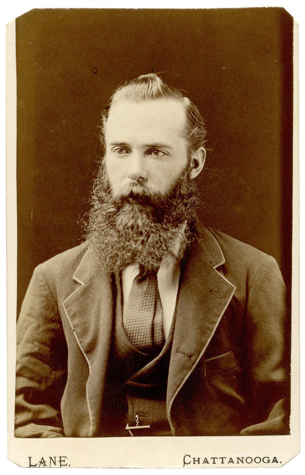 A carte de visite of a bearded man in a three piece suit. The man's suit has a lighter, contrasting trim on the lapels and a dark tie. There is a T-bar watch chain evident in the vest button hole. The bottom of the photograph is labelled "Lane, Chattanooga" and all foud corners have been cut off.Photograph Details