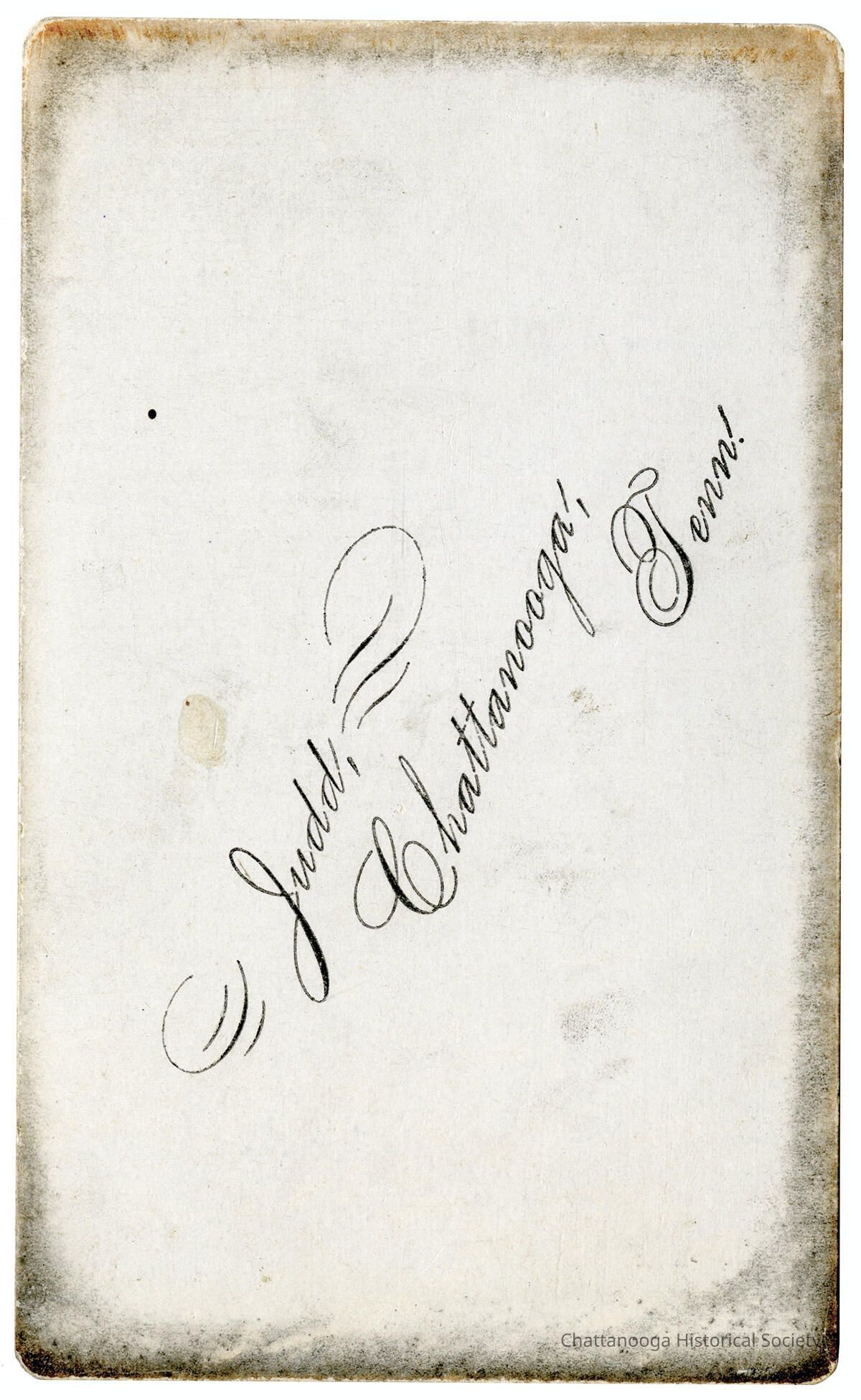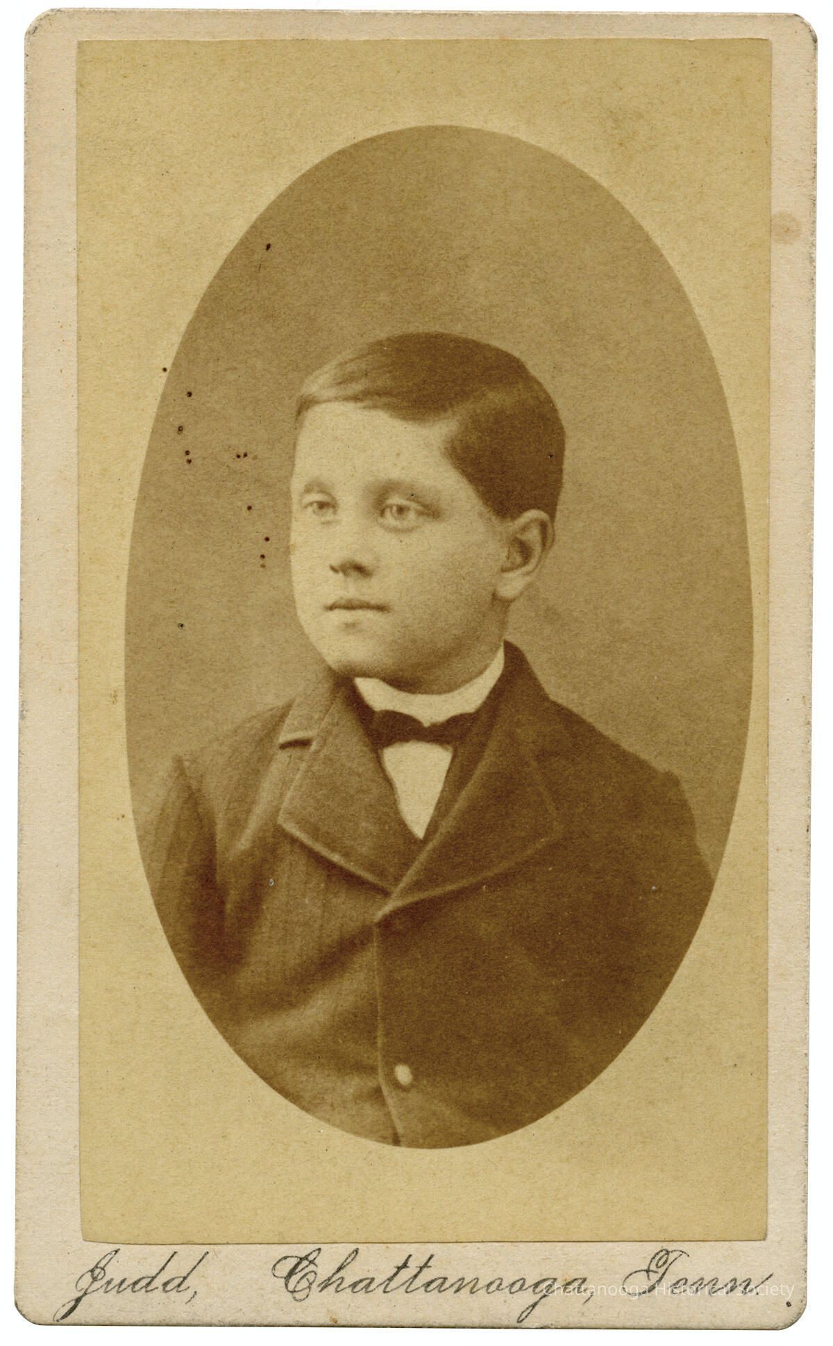 A carte de visite portrait of a young boy. The child is wearing a dark, wool suit jacket with a white collared shirt and dark bow tie. The CDV is labelled "Judd, Chattanooga, Tenn." on the bottom.Photograph Details