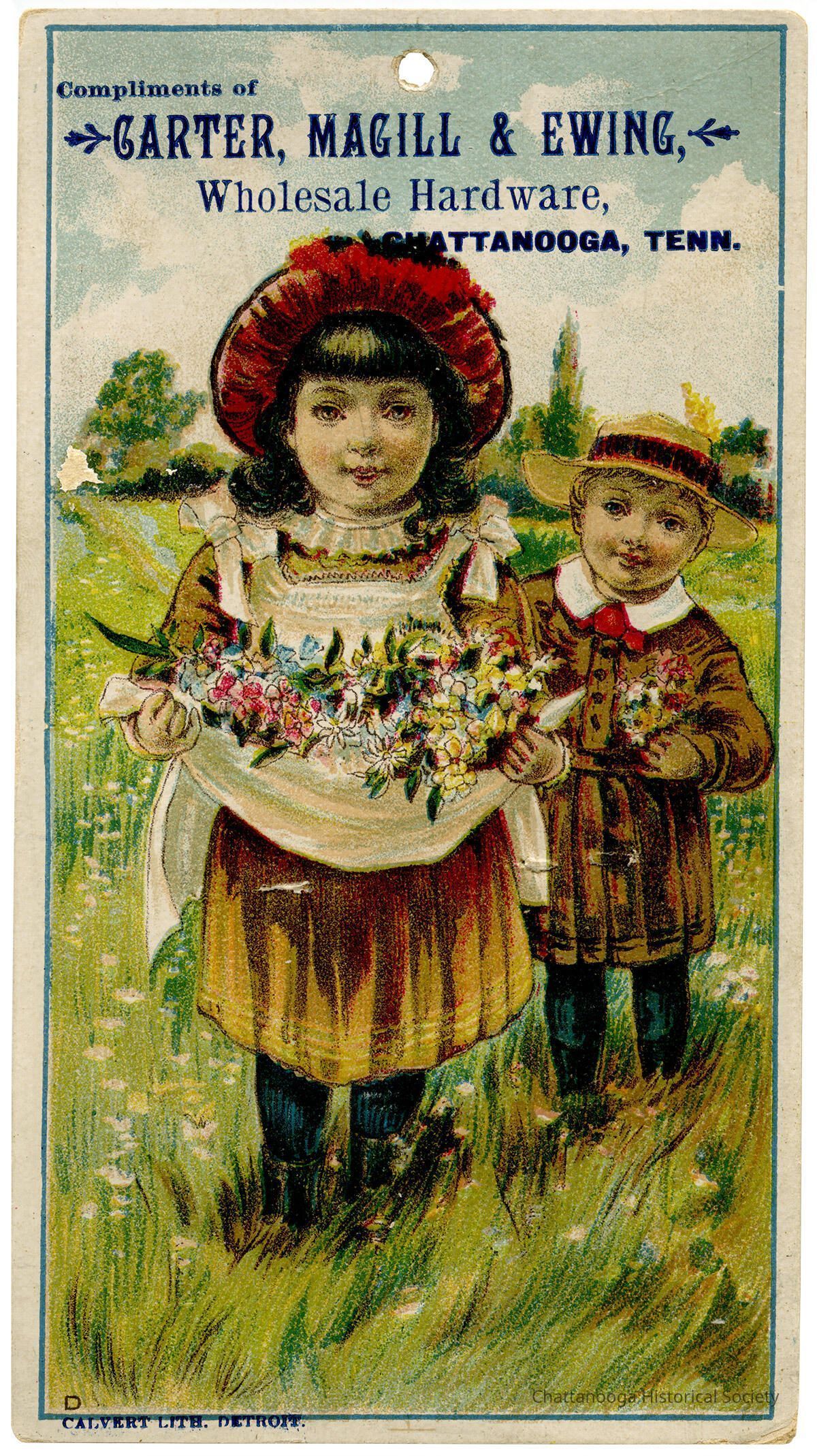 A trade card advertising Carter, Magill, and Ewing Wholesale Hardware. The card features a lithograph of two children, a young boy and girl, gathering flowers in a field. Printed in blue, the top of the card reads "Compliments of Carter, Magill, & Ewing, Wholesale Hardware, Chattanooga, Tenn."Collection