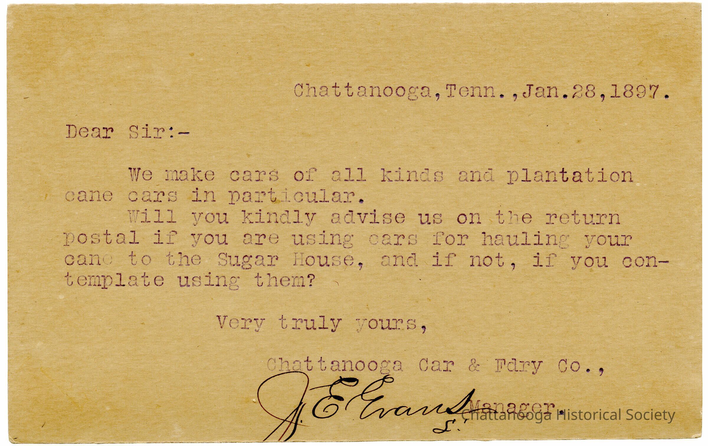 A postal card advertisement from the Chattanooga Car & Foundry Company. The postal card is addressed to P. & J. BergerSubject Person/Organization