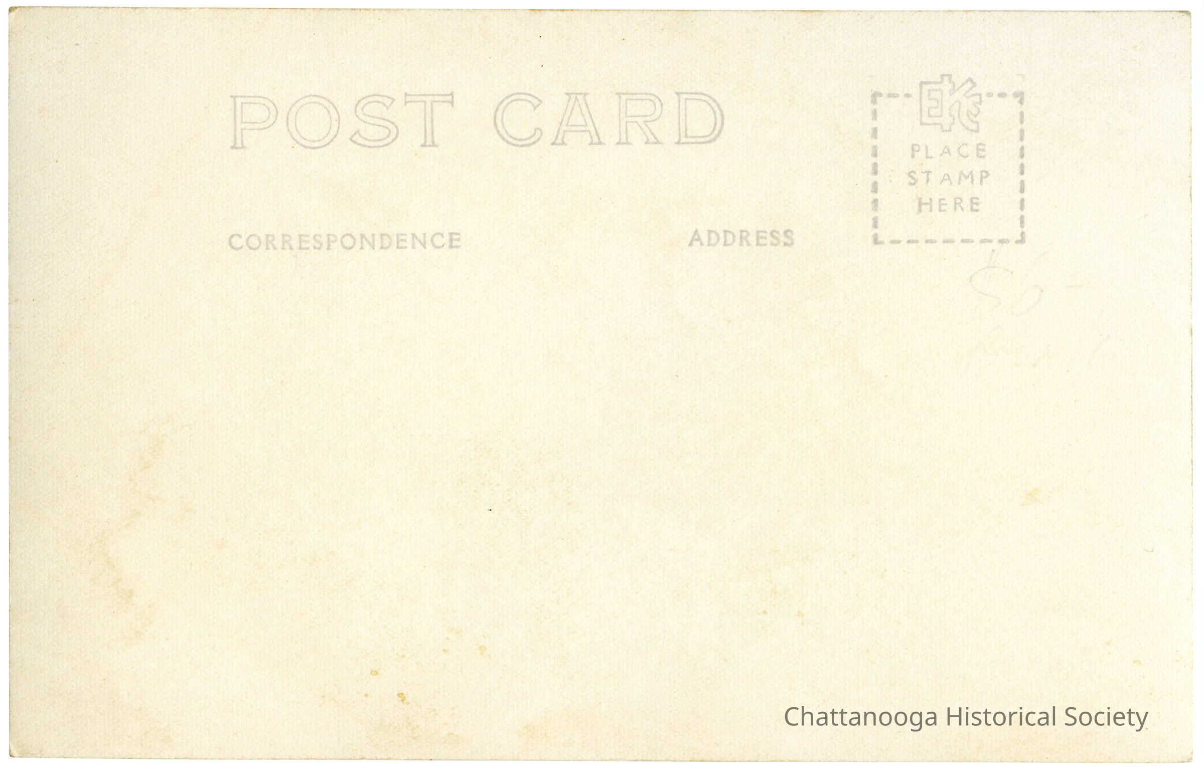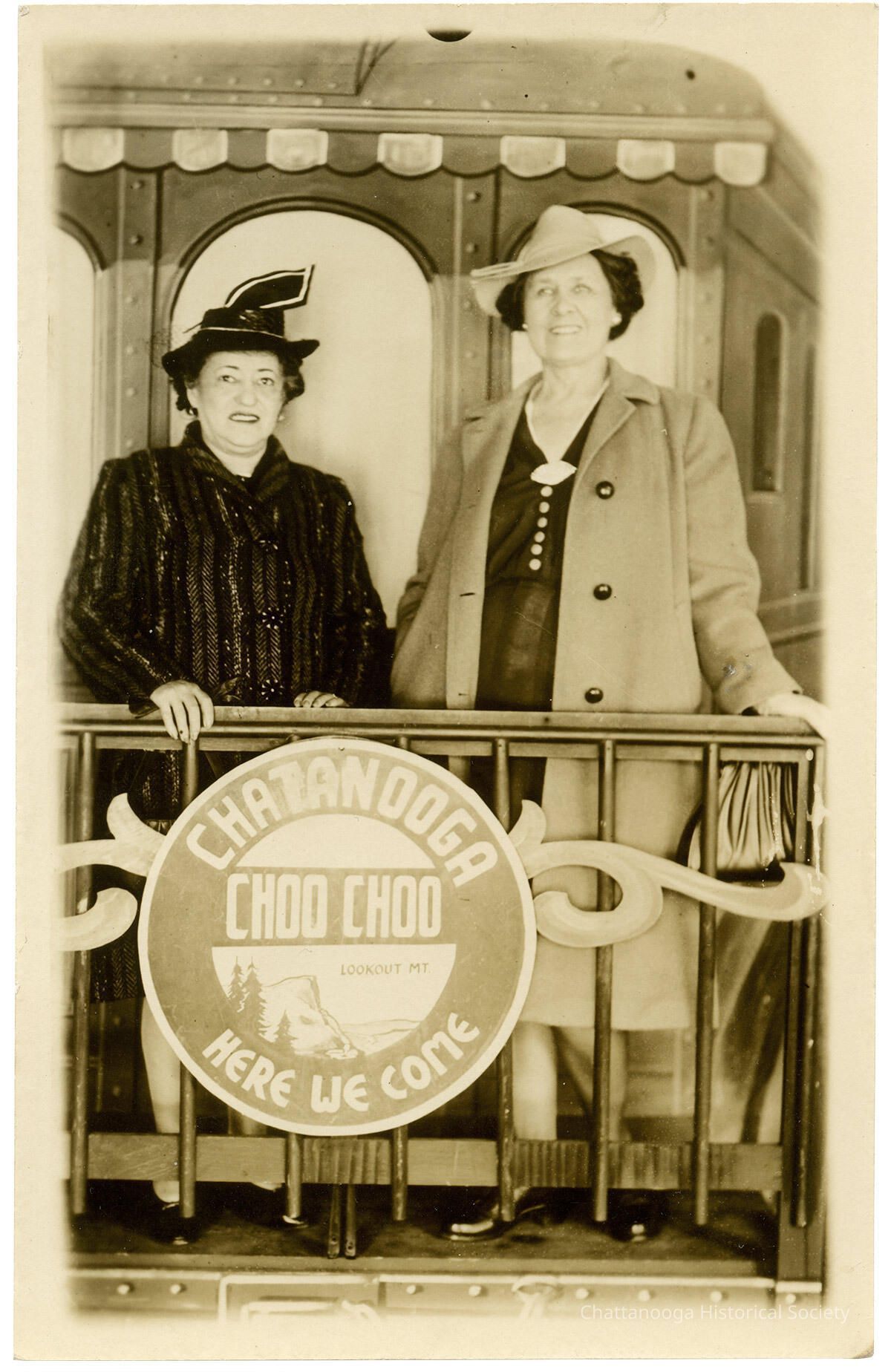 A gelatin-silver printed photographic postcard with the front showing a photograph of two women posing in front of a painted caboose backdrop. Mounted on a prop railing in the foreground is a printed sign, “Chattanooga Choo Choo, Here We Come.” And in smaller type, "Lookout Mt."Subject Person/Organization