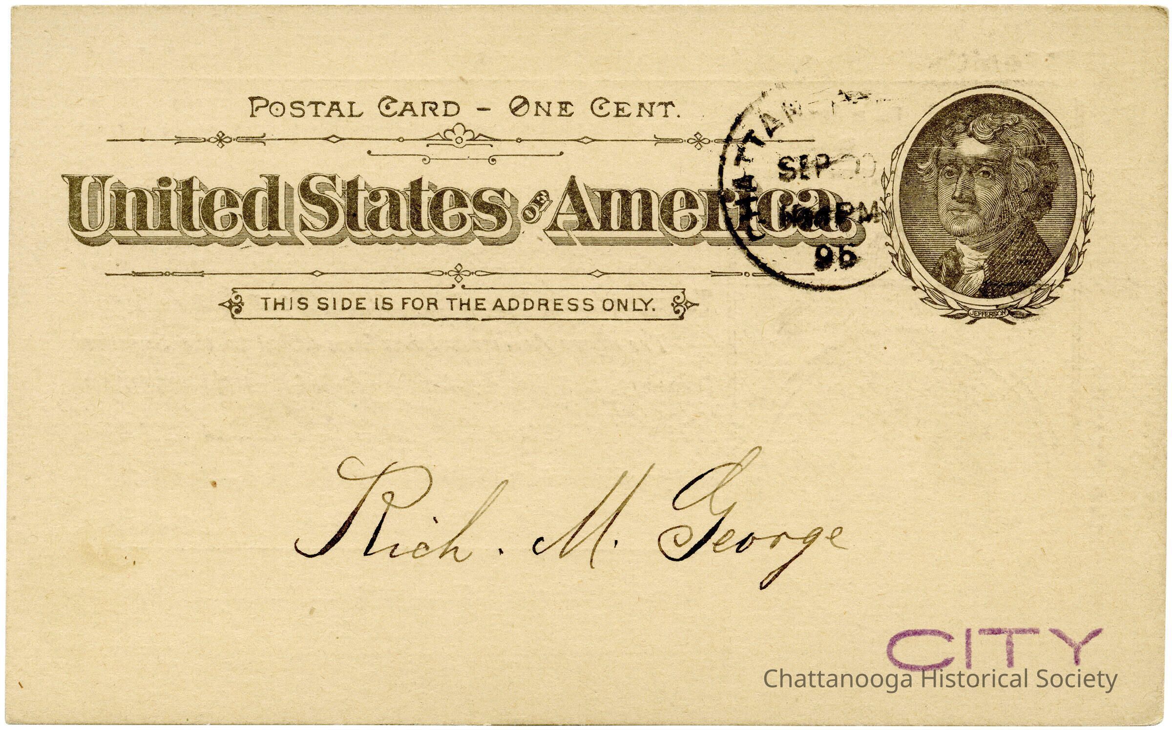 A postal card with the front showing an assessment of $1.16 from the Chattanooga Council, No. 127, Royal Acanum. The card is a membership renewal notice for Rick M. George from the Chattanooga Council. The assessment reads: