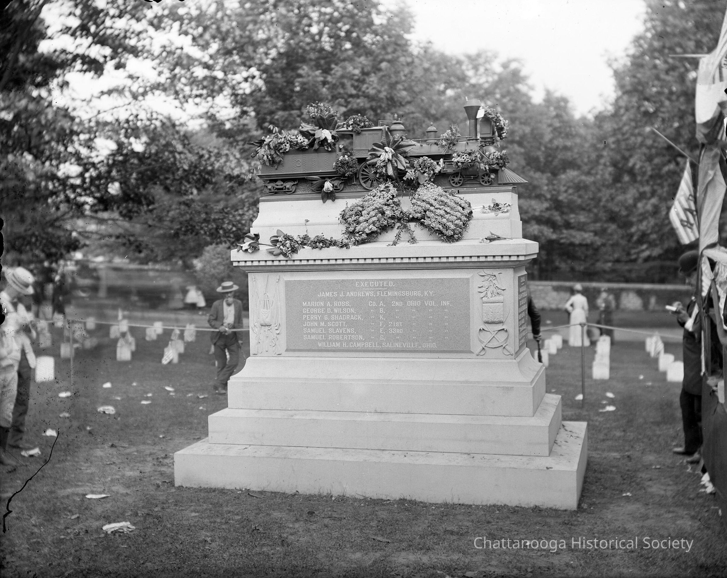 An image from a glass plate negative of the monument to the Andrews' Raiders that was built by Ohio in 1890. The image was likely taken during the unveiling ceremony of monument. The granite pedestal and bronze replica of "The General" are decorated with flowers and garlands, including one arrangement in the shape of two crossed American flags.