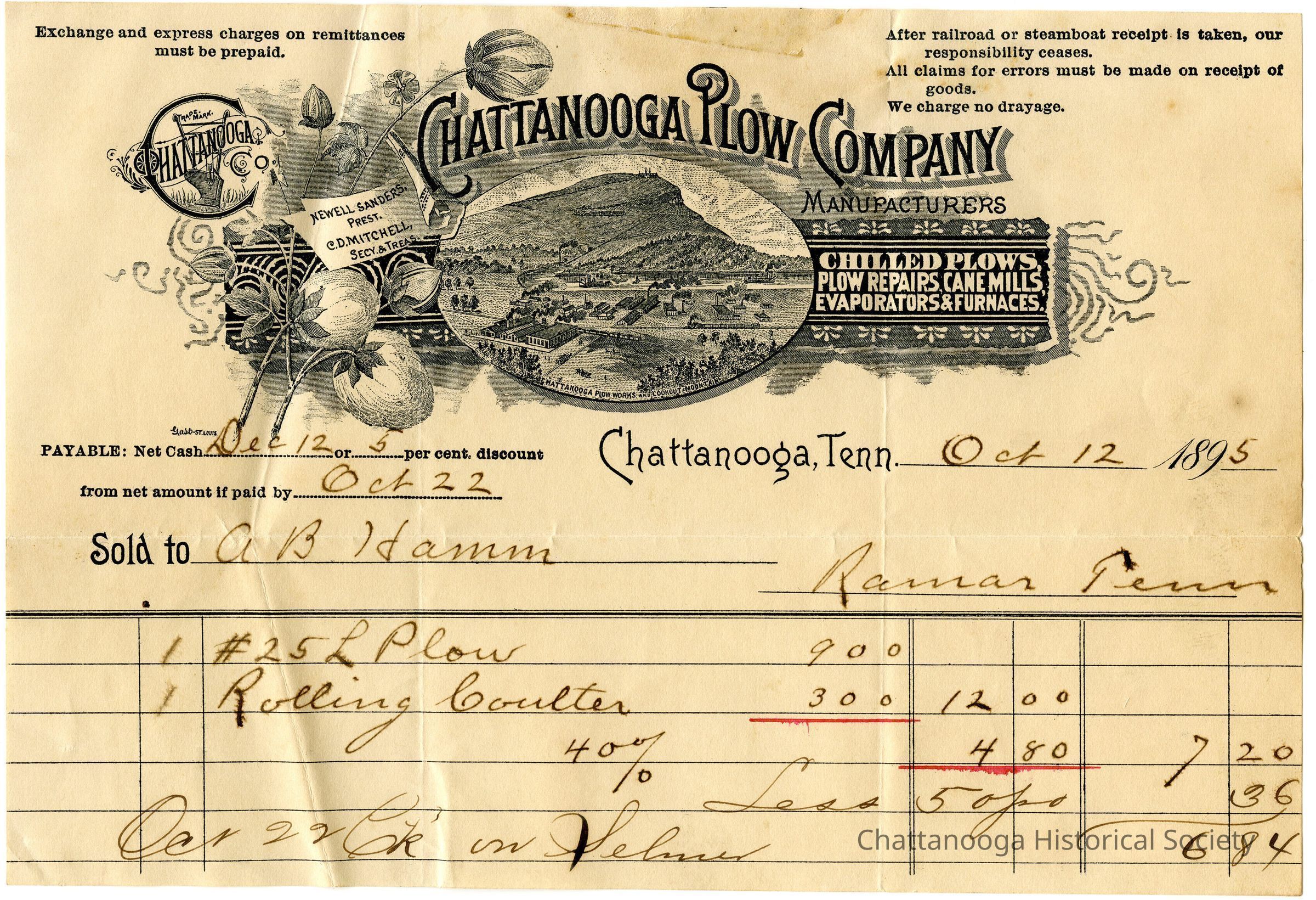 Newell Sanders & Company operated out of an eight-hundred-square-foot building manufacturing plows with castings purchased from Wheland Foundry. By 1881, Sanders and his agents were selling plows in Tennessee, Georgia, and Alabama. Two years later, Sanders, Charles D. Mitchell, George W. Wheland, C. C. Bloomfield, and Judson Buchanan increased the company’s capitalization, moved and expanded the works, built a dedicated foundry, and renamed the organization the Chattanooga Plow Company. Newell Sanders was the first president of the company, and C. D. Mitchell was the secretary and treasurer.
