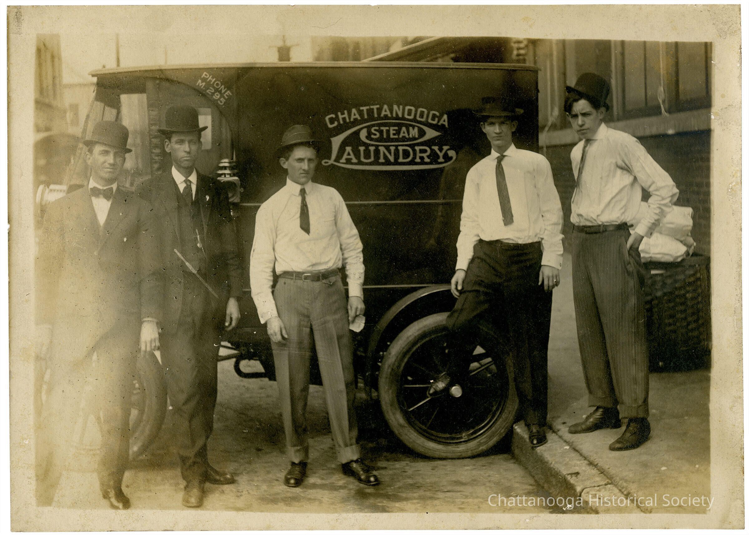 A photograph of five male employees of the Chattanooga Steam Laundry Company in front of a company truck. Two men, at left, are wearing dark suits while the other three men are wearing white dress shirts and pants. The truck has "Phone M. 295" to the right above the door. A container of laundry can be seen at back right. Date(s) of Creation
