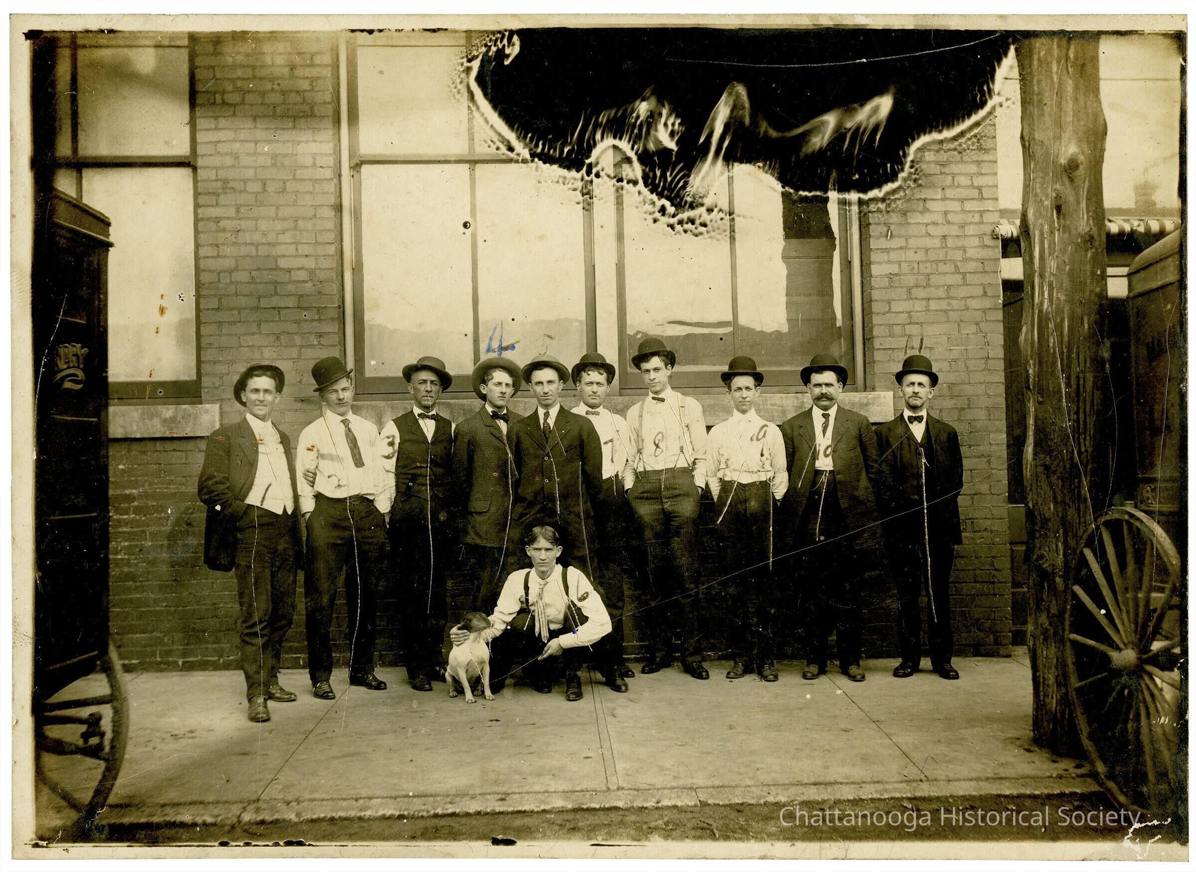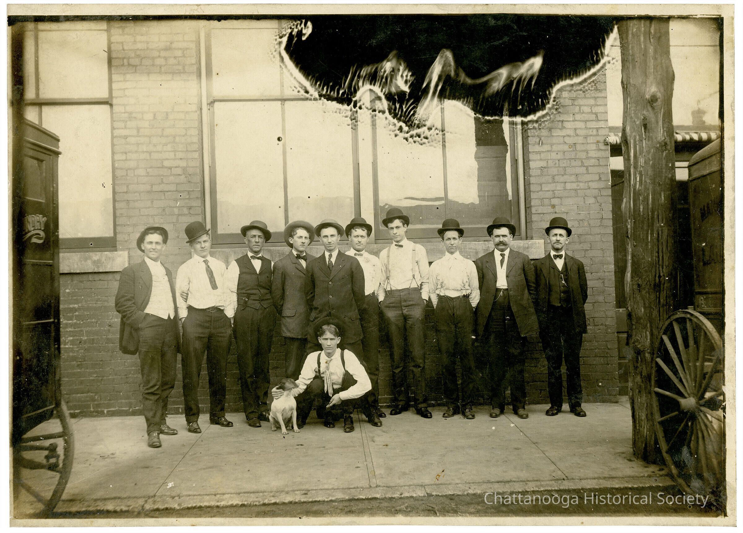 A photograph of eleven employees of the Chattanooga Steam Laundry. Someone has written identifying numbers on the men in the photograph with their corresponding names on the rear of the photograph. Judd Ledford is identified as number 4. A small white terrier is sitting next to the gentlemen listed as #6, Frank Smith.