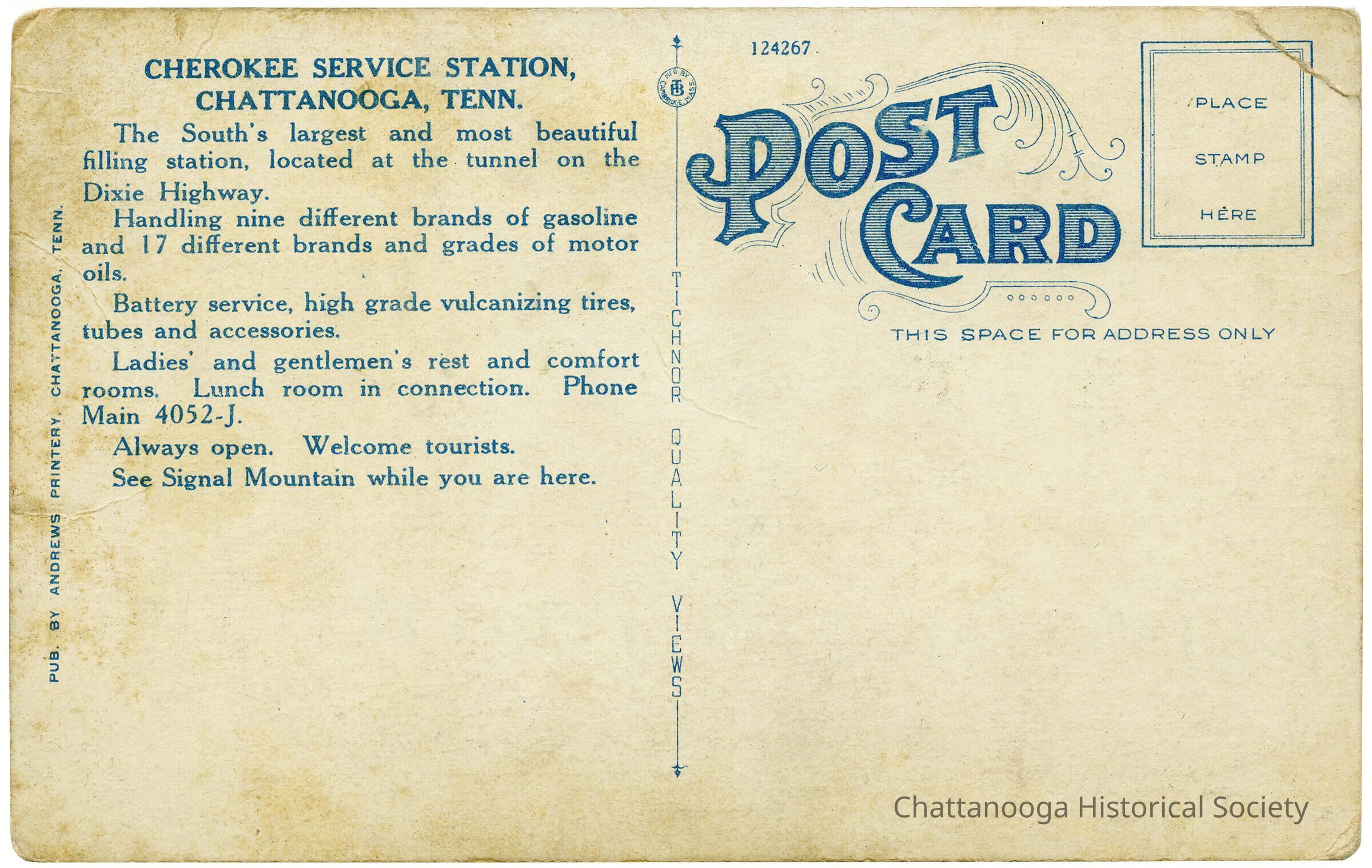 The South's largest and most beautiful filling station, located at the tunnel on the Dixie Highway. Handling nine different brands of gasoline and 17 different brands and grades of motor oils. Battery service, high grade vulcanizing tires, tubes and accessories. Ladies' and gentlemen's rest and comfort rooms. Lunch room in connection. Phone Main 4052-J. Always open. Welcome tourist. See Signal Mountain while you are here."Subject Person/Organization