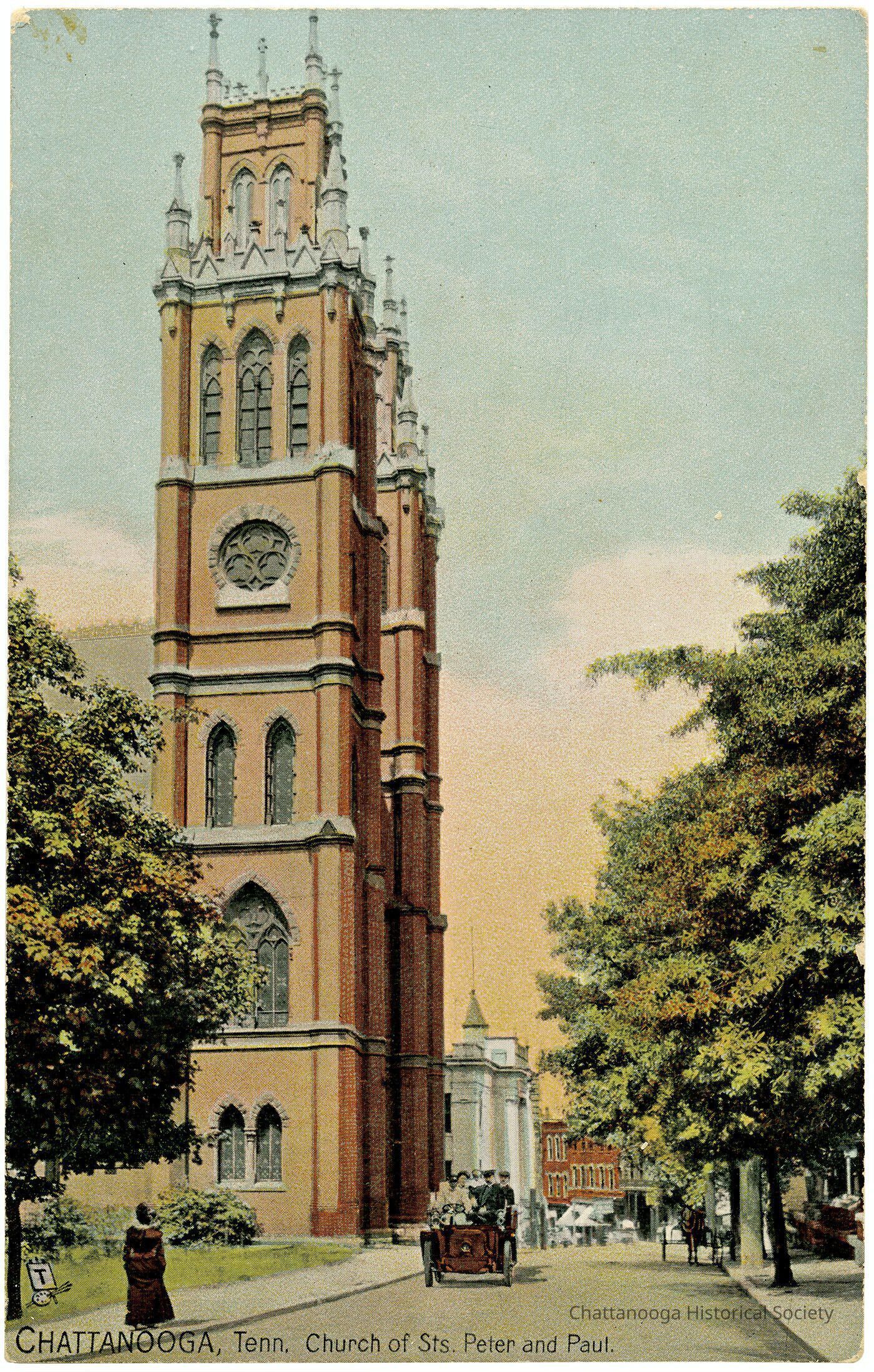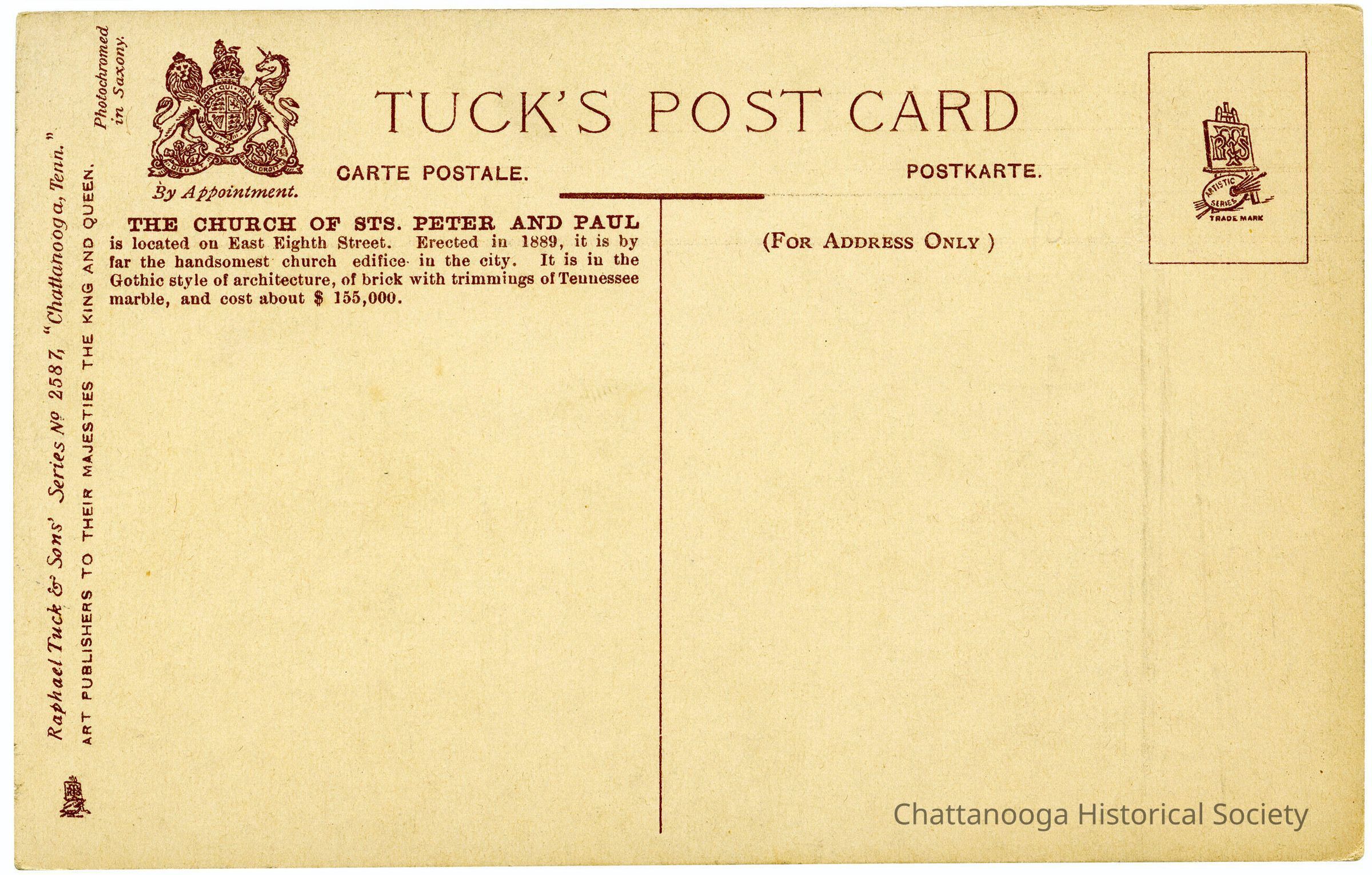 The Recto reads "THE CHURCH OF STS. PETER AND PAUL is located on East Eighth Street. Erected in 1889, it is by far the handsomest church edifice- in the city. It is in the Gothic style of architecture, of brick with trimmings of Tennessee marble, and cost about $155,000."Subject Place