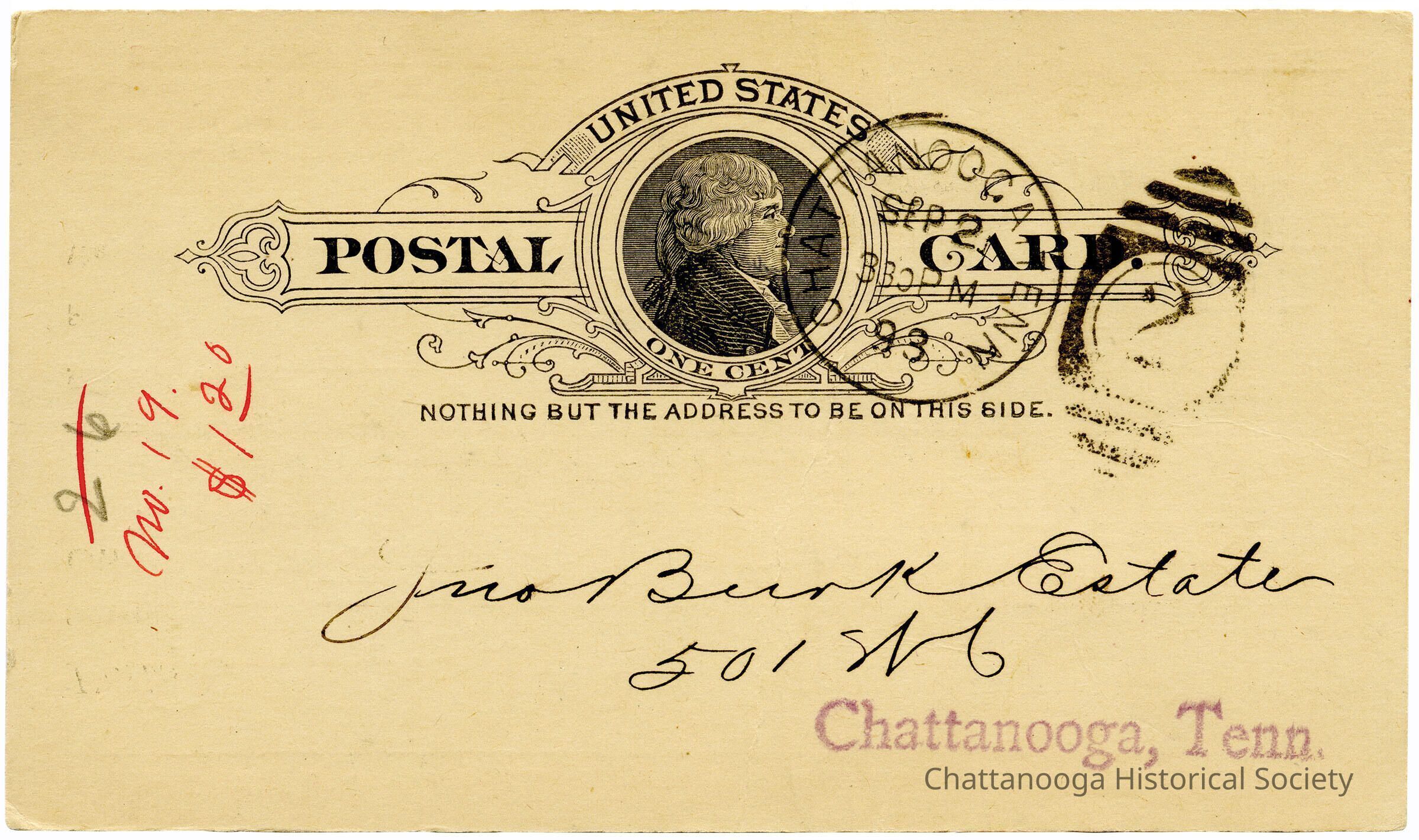 Beige Postal Card from the City Water Company at 928 Market Street. This is a statement from the utility for the John Burk Estate dated 1893.Subject Person/Organization