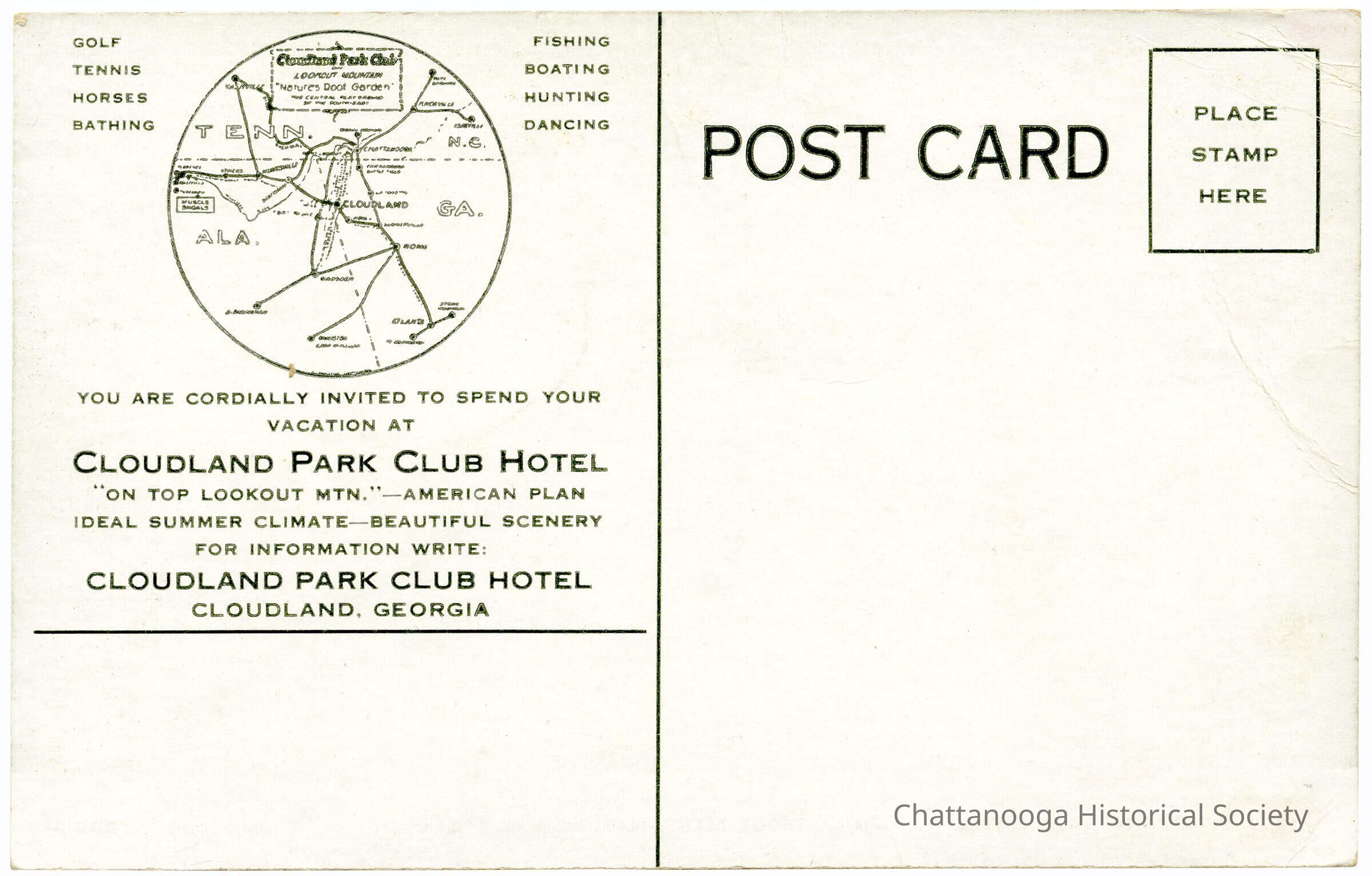 "YOU ARE CORDIALLY INVITED TO SPEND YOUR VACATION AT CLOUDLAND PARK CLUB HOTEL ON TOP LOOKOUT MTN."-AMERICAN PLAN IDEAL SUMMER CLIMATE-BEAUTIFUL SCENERY FOR INFORMATION WRITE: CLOUDLAND PARK CLUB HOTEL CLOUDLAND. GEORGIA"Subject