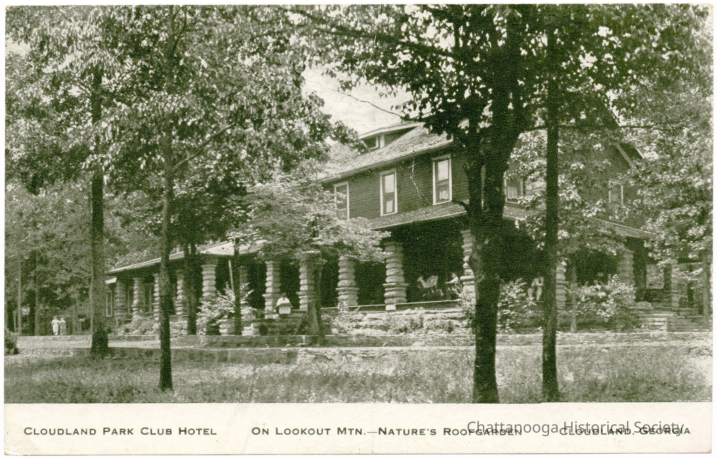 A postcard with the front showing a photograph of the Cloudland Park Club Hotel on Lookout Mountain in Cloudland, Georgia. The front is titled "CLOUDLAND PARK CLUB HOTEL ON LOOKOUT MTN. - NATURE'S ROOFGARDEN CLOUDLAND, GEORGIA"