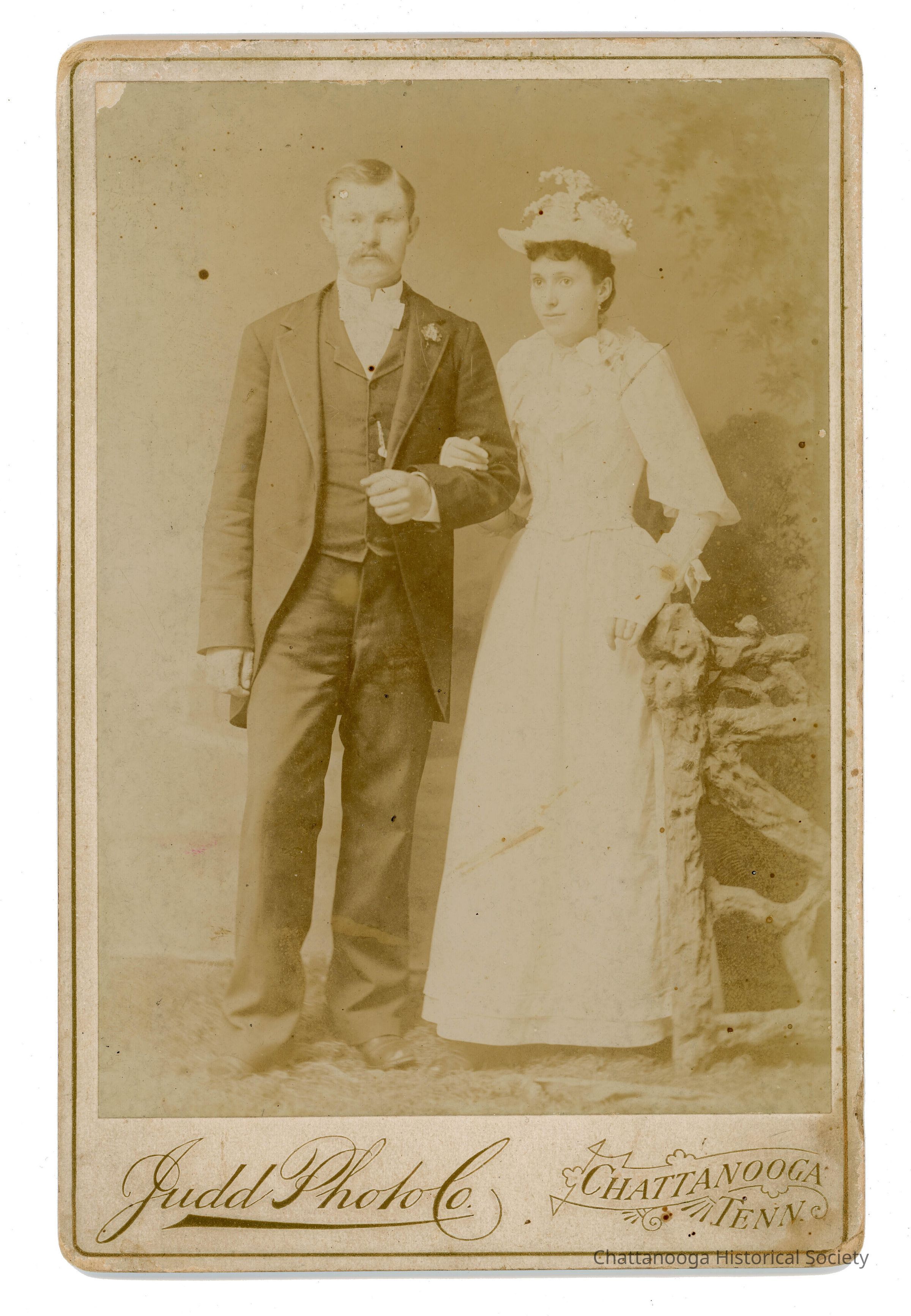 A black and white cabinet card photograph of a couple, possibly for their wedding. The photograph, by Judd Photo Company, shows a woman wearing a white dress and matching, flowered hat. The woman's dress is fitted and corseted at the waist with wide sleeves to the elbow and a corsage on the hand that is wresting on a prop wooden fence. The man with her is wearing a three piece suit with a buttoned waistcoat and a white bow tie. The photograph is printed "Judd Photo Co. Chattanooga | Tenn" in the bottom gutter.