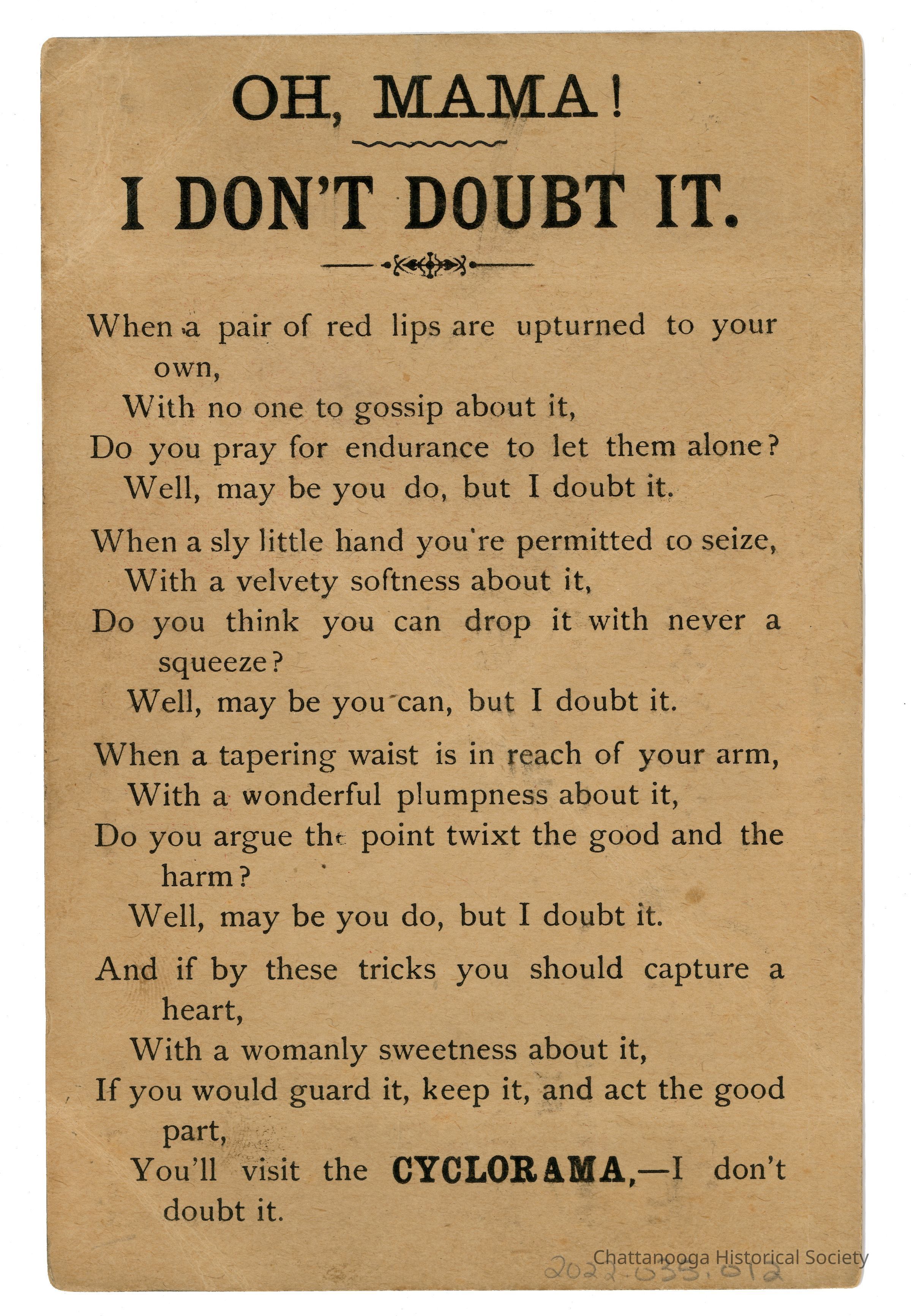 An engraved trade card advertising for the Cyclorama. The card consists of a red inked engraving of the round building located near the Union Depot, in between Boyce and Carter Streets by contractor H.C. Jackson for . The structure, which was custom built to house the large panoramic paintings and dioramas, had a mansard roof with a dome at the top. Word on the side of the structures reads "CYCLORAMA, Storming of Missionary Ridge and Lookout Mountain". The entrance to the building consisted of two towers with crenelated peaks and lancet windows. Several horse drawn conveyances are on the street in front of the Cyclorama: a closed carriage and what appears to be a cannon in a wagon. Beside the structure is a tall tower structure (possibly what an article referred to as the "Missionary Ridge Battle Tower" and "10 McNally Co" is printed beneath it.