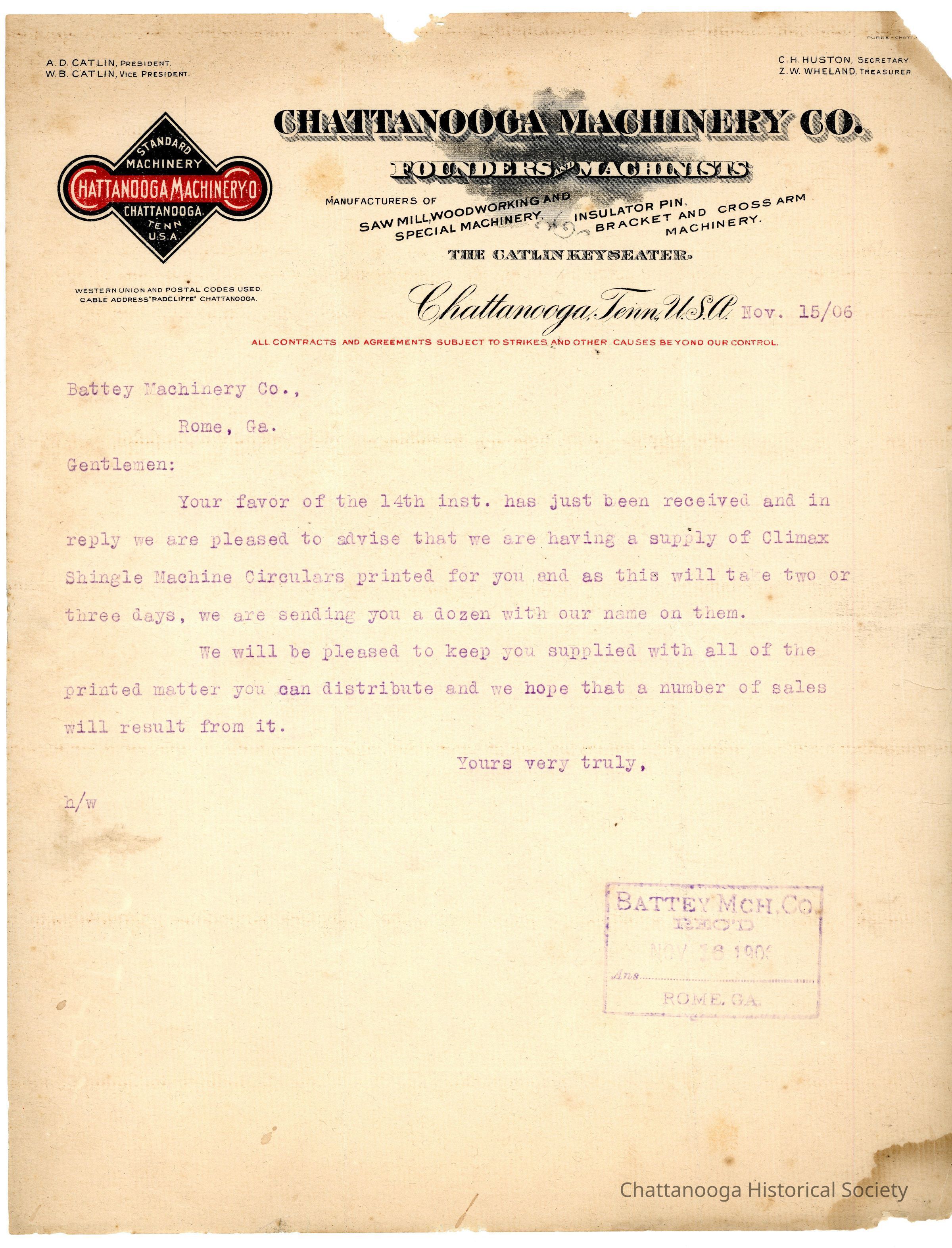 Letter from the Chattanooga Machinery Company to the Battery Machinery Company dated 15 November 1906. The letterhead has the Chattanooga Machinery Co. logo at top left as well as a decorative type at top center that reads "Chattanooga Machinery Co. | Founders and Machinists | Manufaturers of Saw Mill, Wood Working and | Special Machinery | Insulator Pin, | Bracket and Cross Arm | Machinery. | The Catlin Keyseater. | Chattanooga, Tenn. U.S.A. | All Contracts and Agreements Subject to Strikes and Other Causes Beyond Our Control." At top left, the letterhead reads A.D. Catlin, President | W.B. Catlin, Vice President" and "C.H. Huston, Secretary | Z.W. Wheland, Treasurer" at top right.