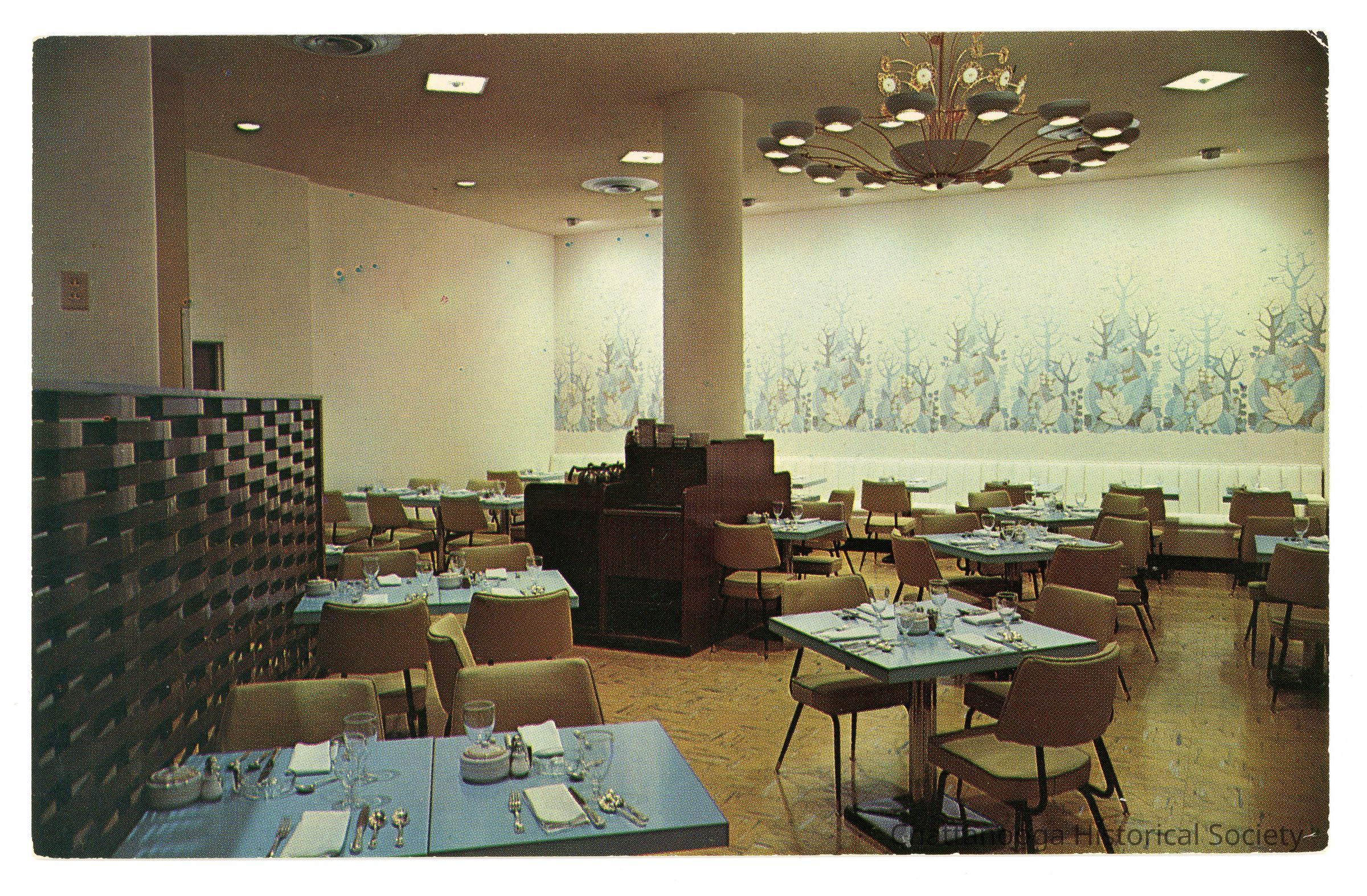 Postcard showing the interior of The Garden Room inside of the "restaurant village" in the Hotel Patten. The view shows midcentury dining room and mural on the back wall. The information blurb on the rear reads "THE GARDEN ROOM IN THE | RESTAURANT VILLAGE | Hotel Patten - Chattanooga, Tennessee | A Pleasant Place to Start Your Day At Breakfast And To Enjoy Luncheon." The postcard is a "Color-King Natural Color Card"Subject Person/Organization