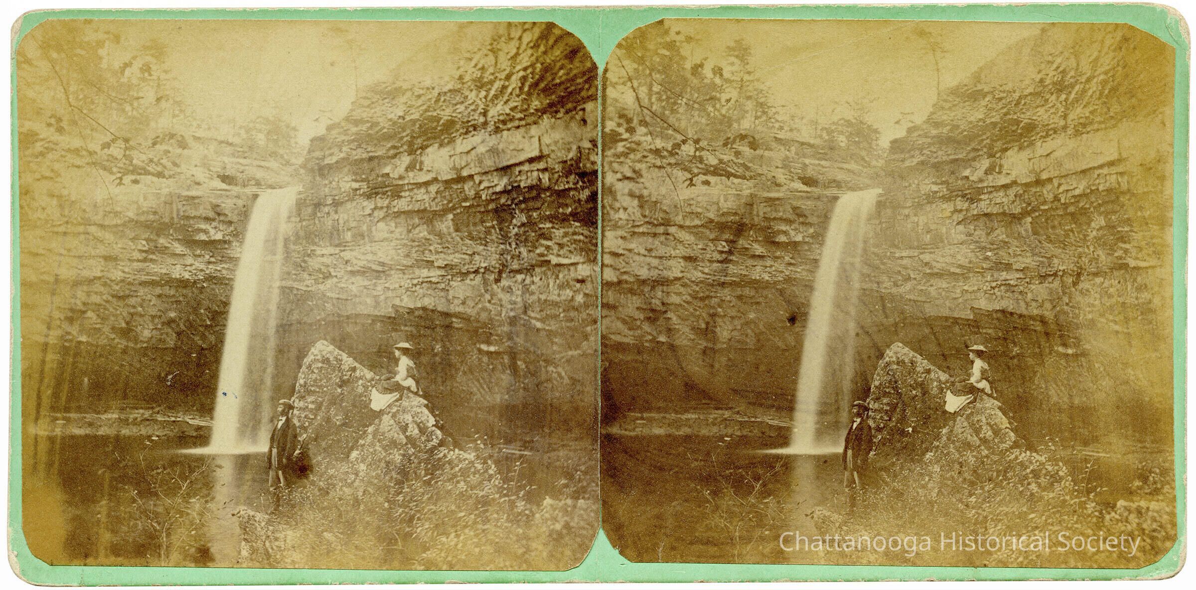 A stereographic view showing a couple in the front of DeSoto Falls in Lumpkin County, Georgia. DeSoto Falls is a 104-foot waterfall located on the West Fork of the Little River near Mentone, Alabama, in DeSoto State Park. The falls have carved their own small canyon. They are named after Spanish explorer Hernando de Soto.Photograph Details