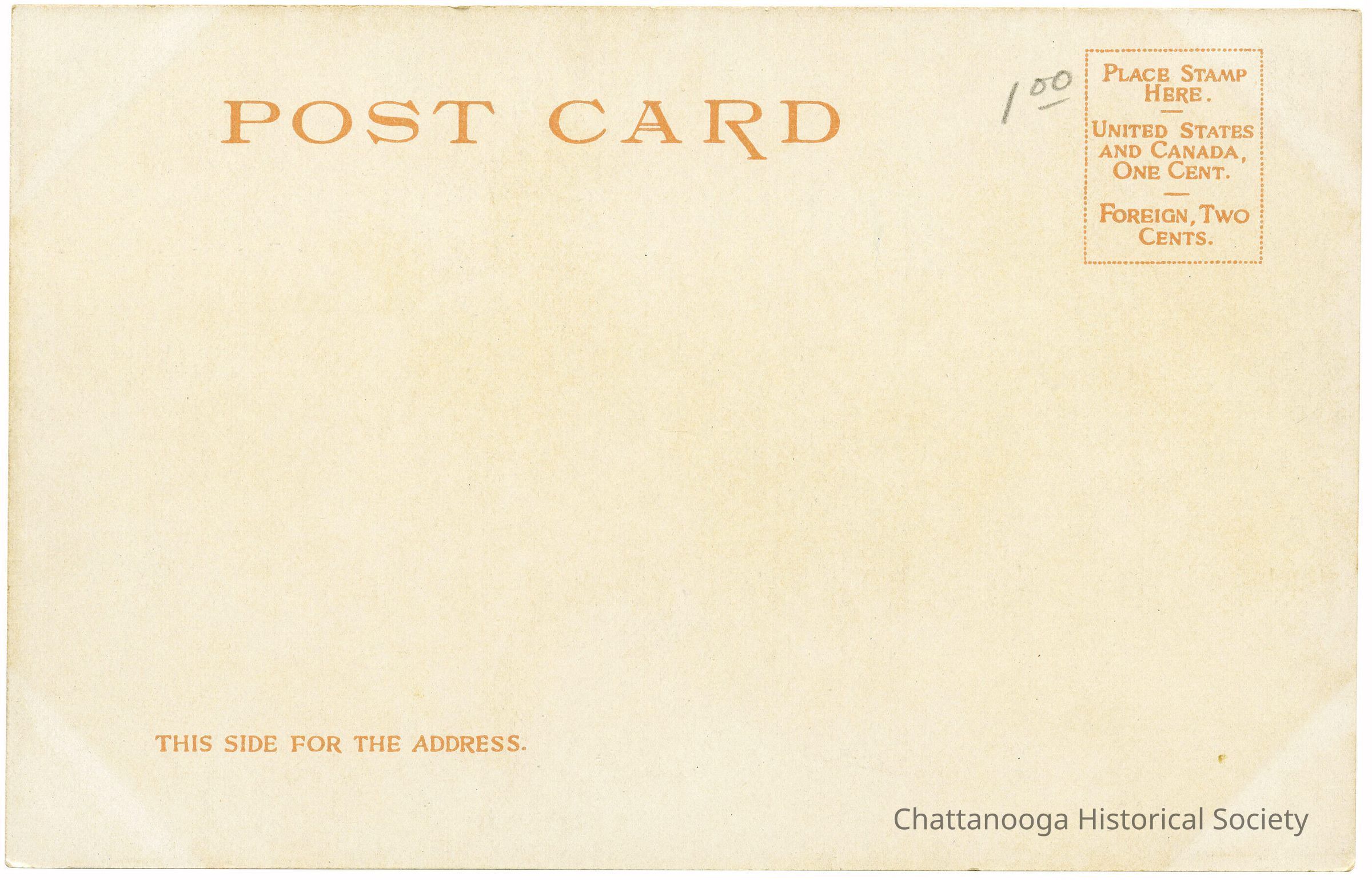 2020.494.001 - Blue tinted postcard showing the front façade of the Lookout Inn from the street. The postcard also shows the narrow-gauge railway that ran in front of the inn. "Greetings from Above the clouds. Cousin Henry" is written in the gutter on the front of the card. The rear reads "Lookout Inn, Lookout Mountain - Lookout Inn standing on the highest point of Lookout Mountain was erected in 1899, at the cost of about $250,000. The building is four stories high, surmounted by an observatory tower, and is surrounded by elegant porches. It contains nearly 500 guest chambers and is elaborately and richly equipped with all modern conveniences.Creator
