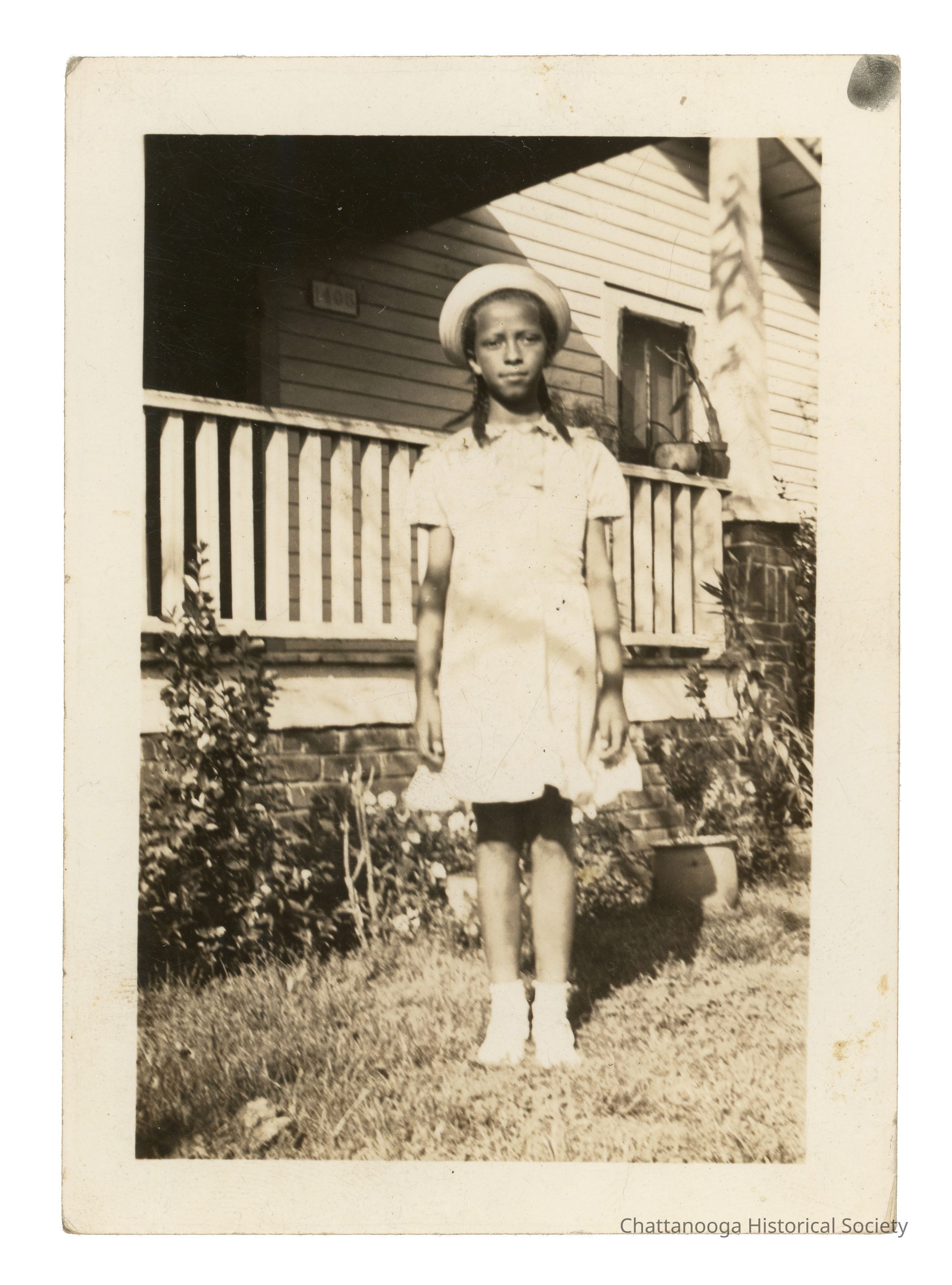 Digital scan of a Black and white photograph of a young girl standing in front of a porch.Photograph Details