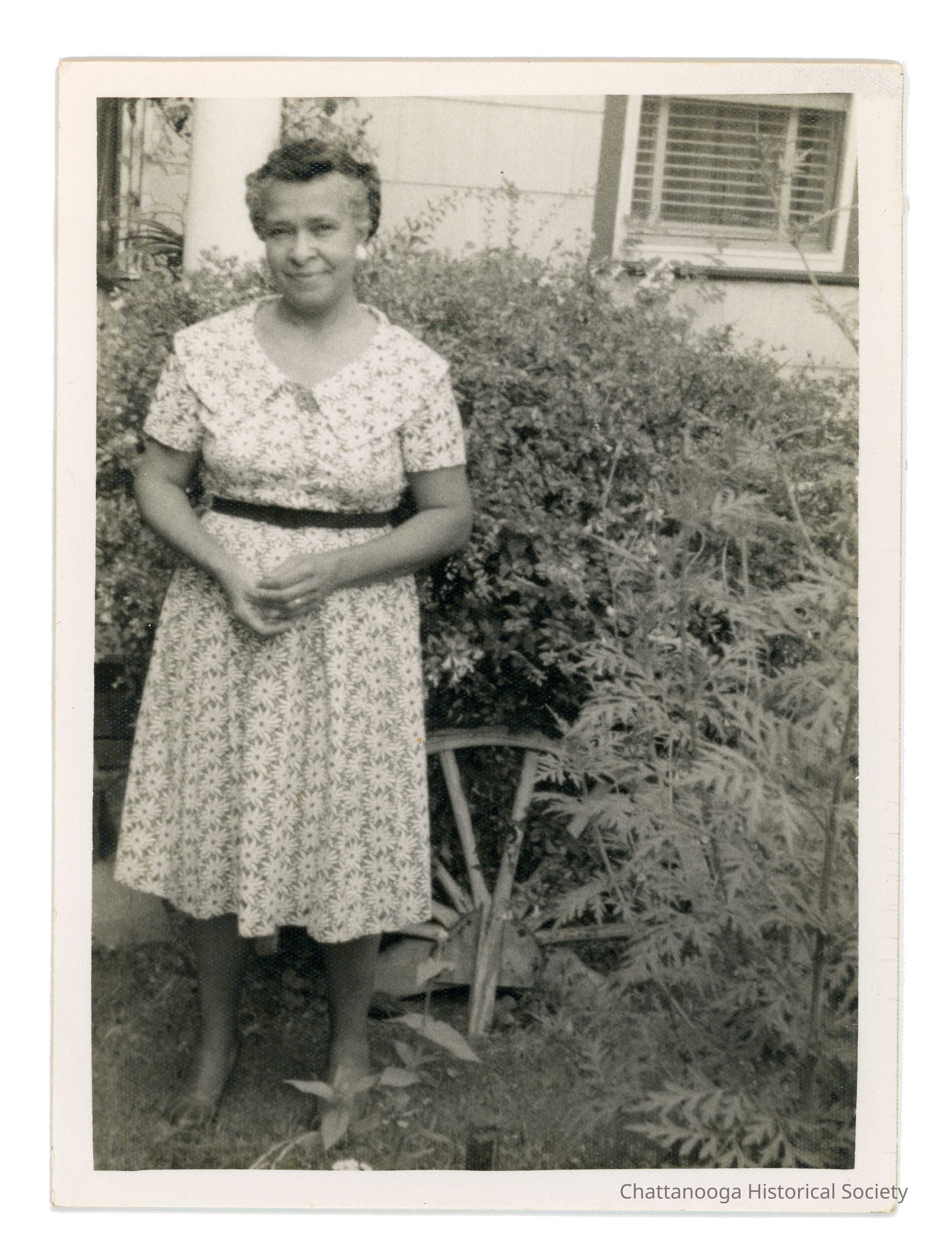 Digital scan of a black and white photograph of a woman in a daisy print dress.Photograph Details