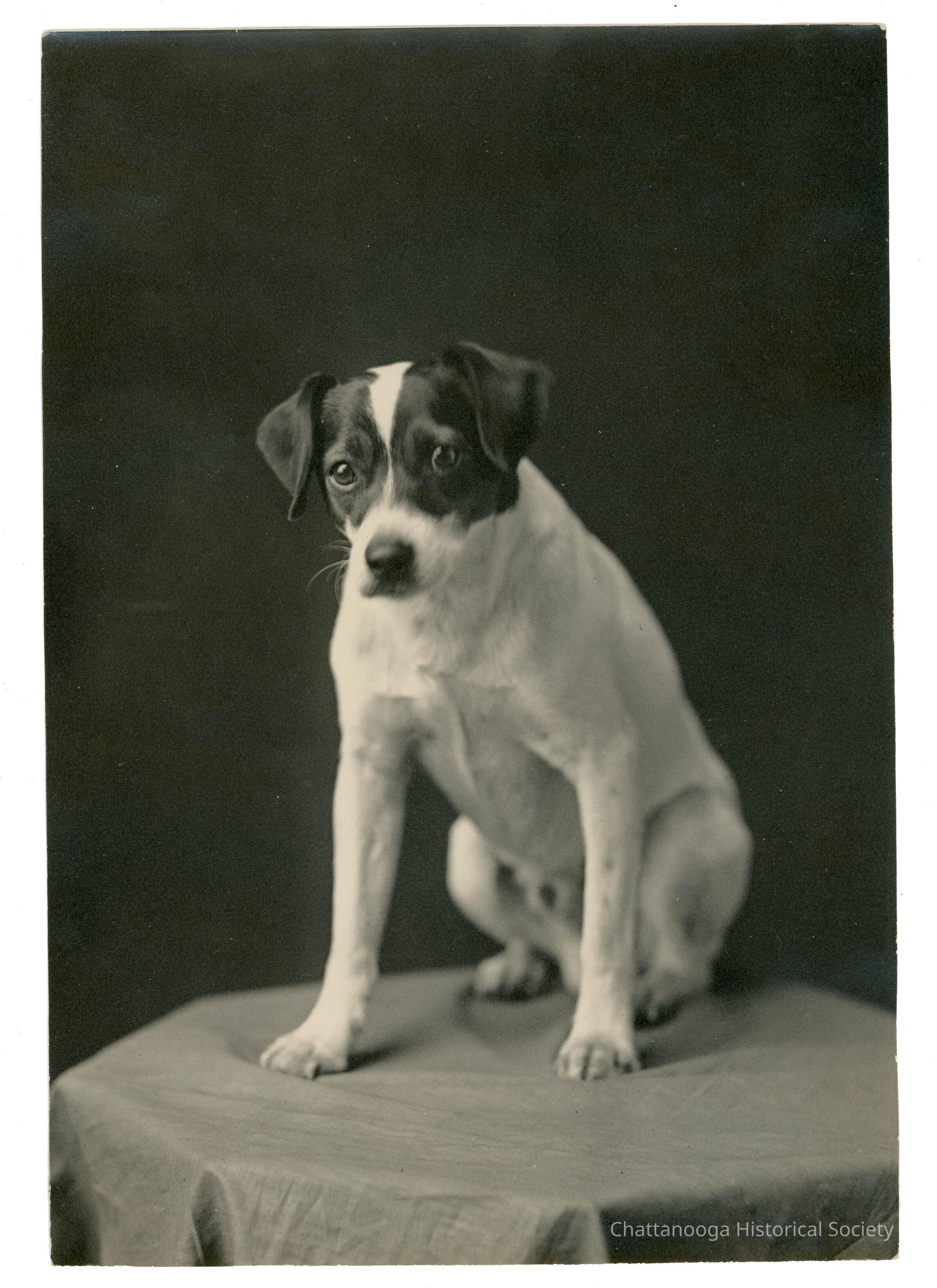 Black and white studio portrait of a Jack Russell Terrier. The dog is sitting behind a studio backdrop on a octagonal side table that is covered in a grey cloth.Photograph Details