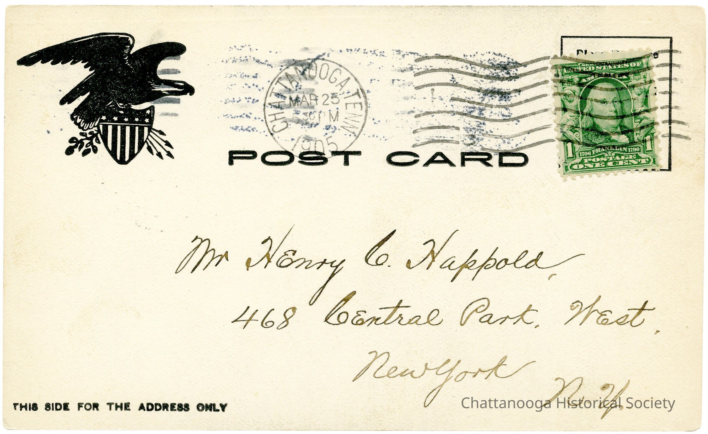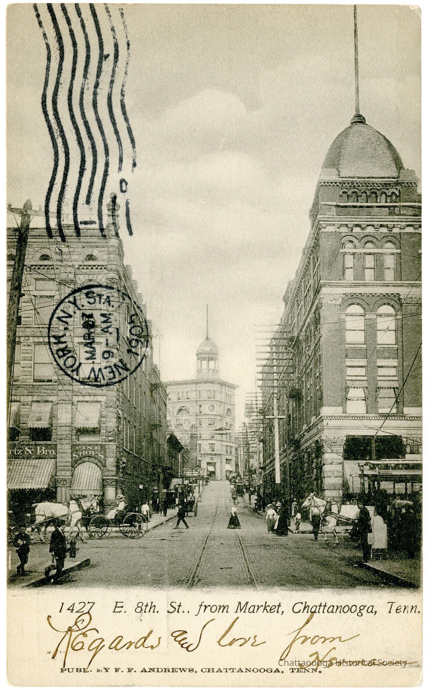 A postcard with the front showing a photograph of the intersection of E. 8th and Market Streets looking east from W. 8th Street. The Dome Building is straight ahead on Georgia Avenue, and D.B. Loveman & Co. Department Store on the S. E. Corner of Market and 8th Streets.Subject Place
