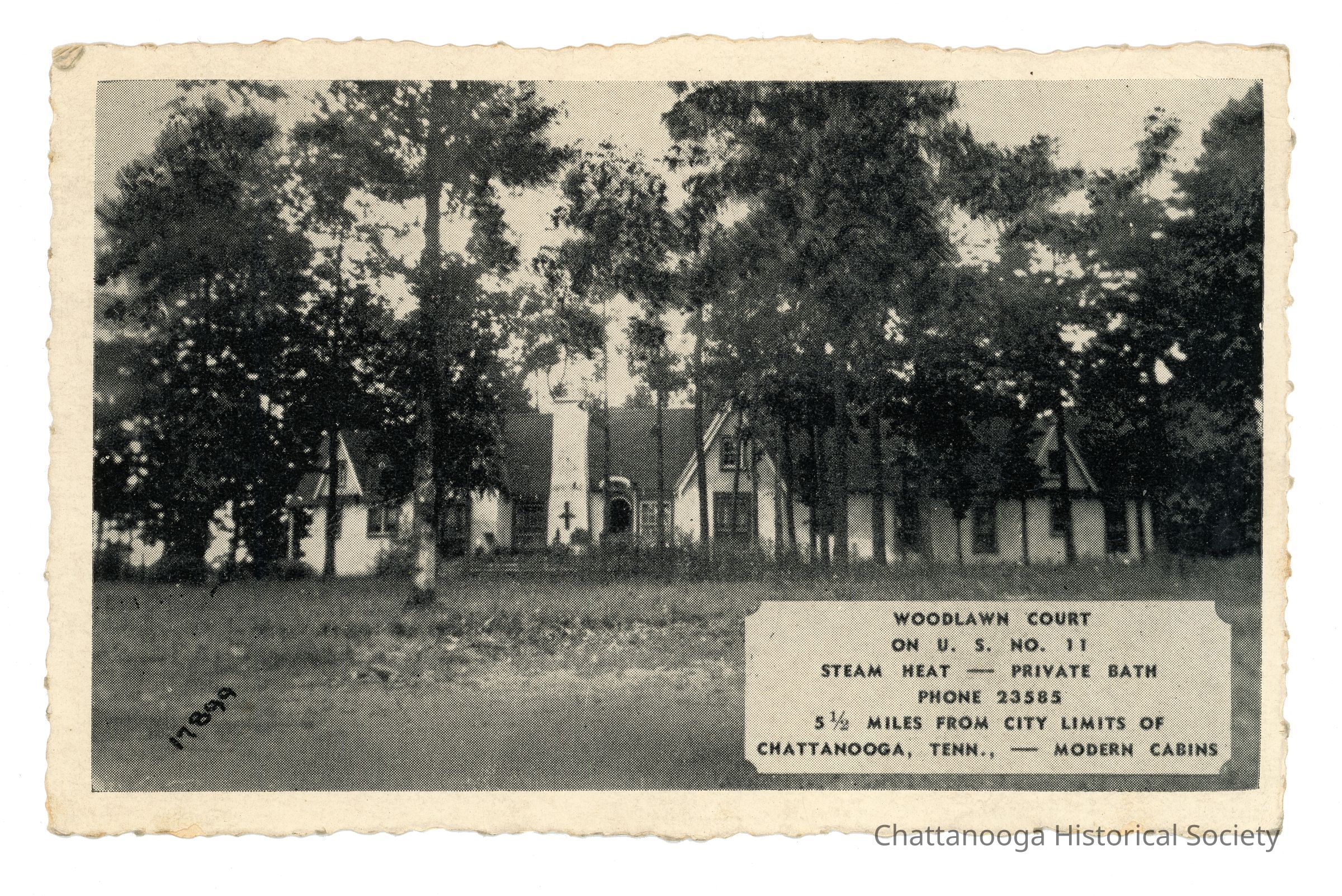 Black and white photograph printed on postcard paper of a home on Lee Highway. The real photograph postcard with a decorative white border features a white stucco dwelling with a steeply pitched roof behind a line of trees. A text box at bottom right reads "Woodlawn Court | On U.S. No. 11 | Steam Heat - Private Bath | Phone 23585 | 5 1/2 Miles from City Limits of | Chattanooga, Tenn., - Modern Cabins" and the card is numbered 17899 in black at the bottom, left.