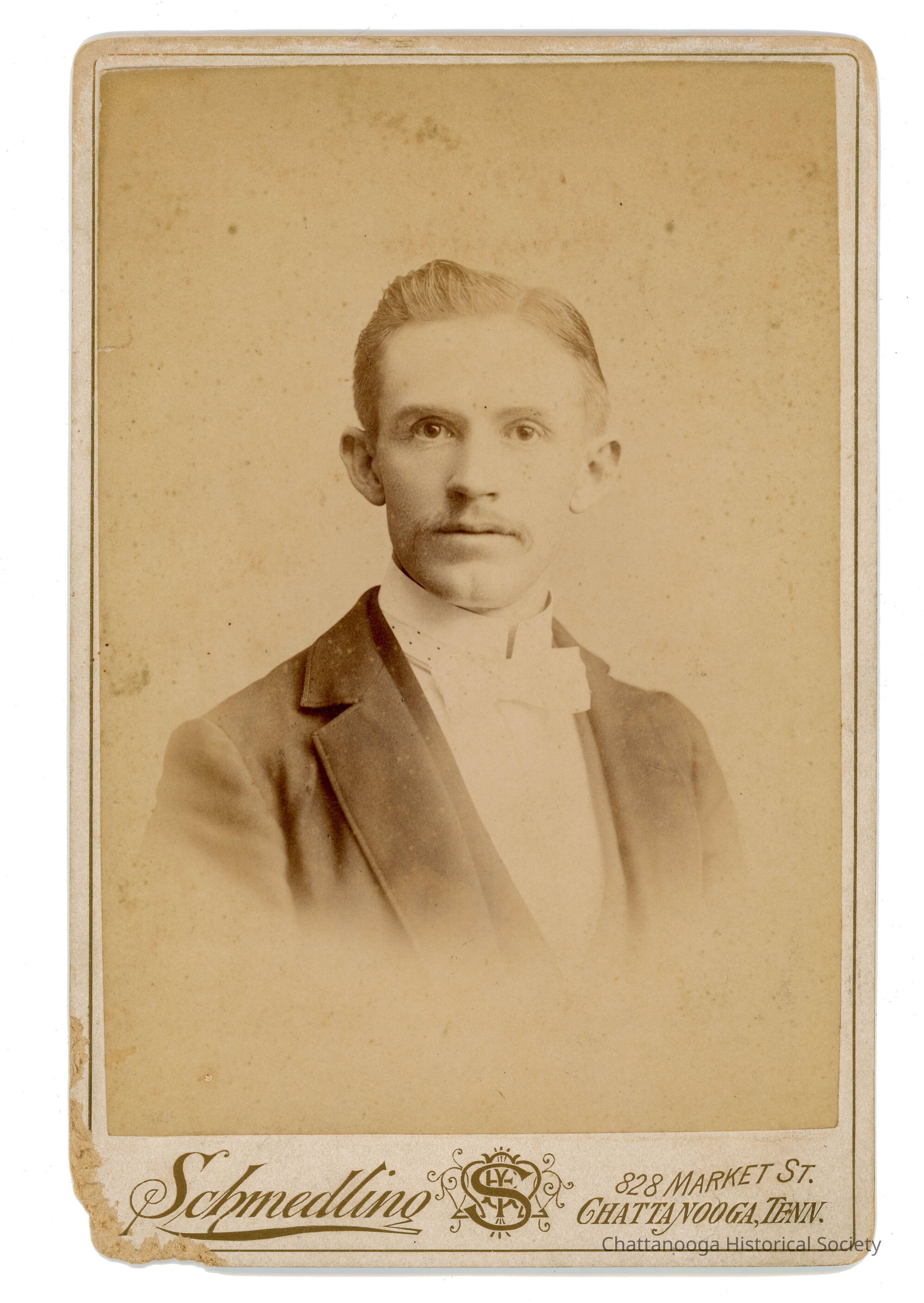 Black and white cabinet card photograph of a man identified as Ed Wright. The studio portrait by Schmedling shows a younger man wearing a white shirt with a high starched collar and a white bow tie. He is also wearing a dark suit and vest. The photograph is marked "Schmedling, 828 Market St | Chattanooga, Tenn." in gold in the bottom gutter. The car also features the Schmedling graphic on the rear with a wildflower bouquet and "Scmedling | Photographer | 828 Market St, Chattanooga, | Tenn." in gold.Photograph Details