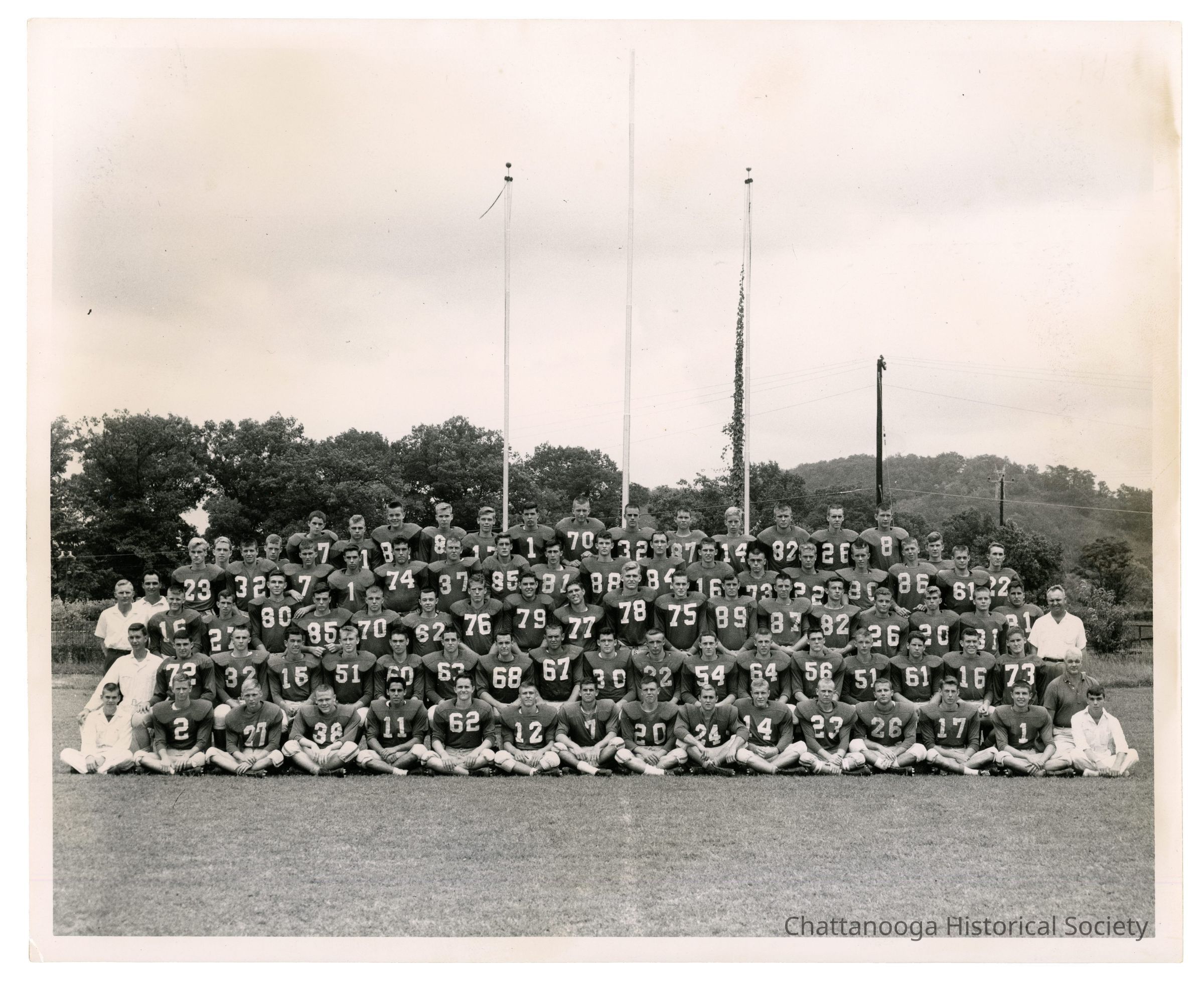 A black and white photograph of an unknown football team (believed to be Tyner High School or Junior High School). The photograph shows five rows of uniformed football players with staff posed at both ends of rows 1-3.Collection
