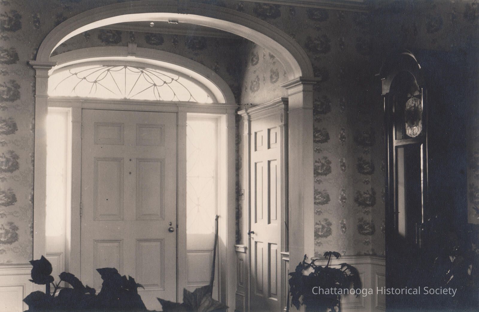 Black and white photograph of the entryway to Frieda Carter's home on Lookout Mountain, GA located in what is now Rock City Gardens. The photograph shows a grandfather clock to the right of the entryway with potted plants in the foreground. The front door is a six panel door with a large glass fanlight above and flanking sidelights covered in an opaque fabric.