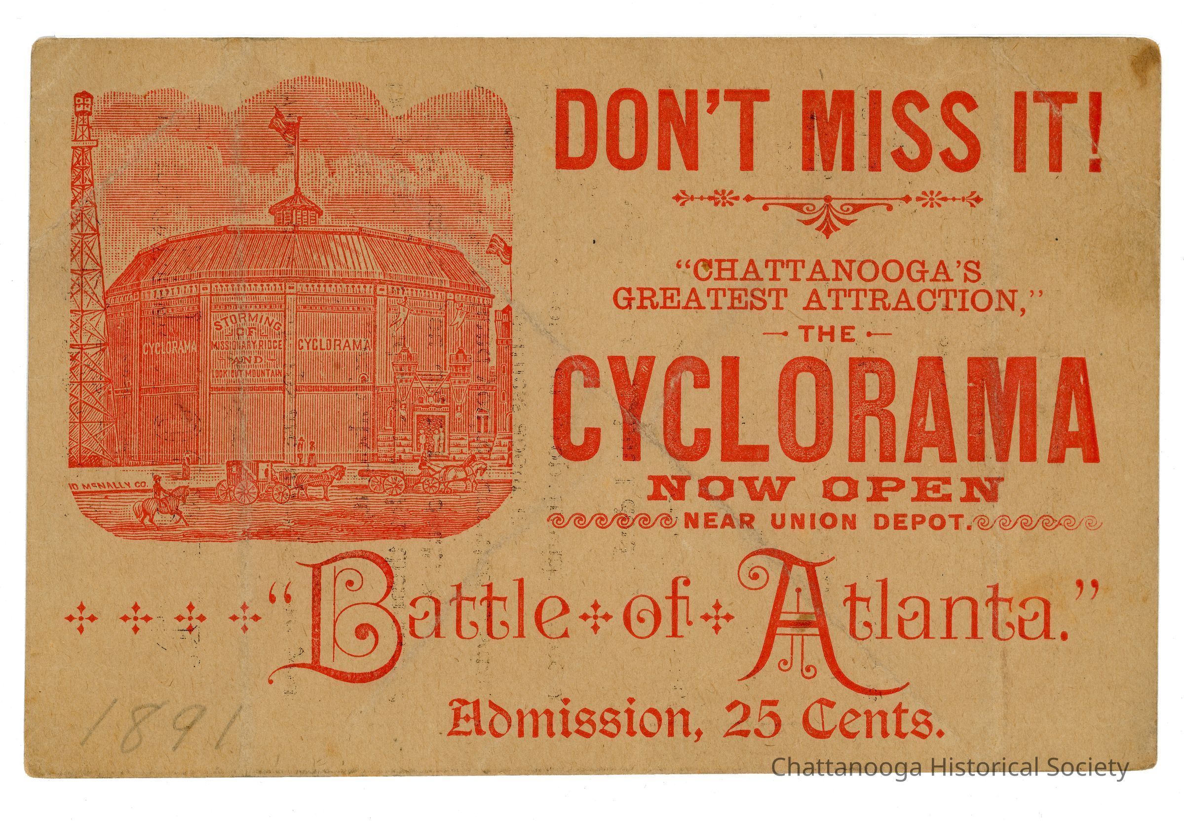 The cyclorama opened 1 July 1890 to the public to show the 14,000 pound painting of the Battle of Missionary Ridge, with the plan that the building would be finished and the panoramic (which was previously on display in Philadelphia) would be exhibited to Chattanoogans. The panoramic painting measured 50 x 400 feet and was painted by Eugene Bracht, Karl Roechling, George Koch and their assistants who painted it in Germany after a study of the battleground. Another artist, Thomas Esori, touched up any damage to the painting when it was received from Germany where the painting was finished. When it was shipped, the duty on the painting cost $10,000. The cyclorama is a 100 degree view of a battle scene with a central viewing platform. The ground floor up to the painting edge was a diorama filled with three dimensional terrain. The painting went on display in 1890 but was moved to Atlanta's Cyclorama in 1891 while the above advertised "Battle of Atlanta" was on exhibit. As the years passed, the Cyclorama fell into disrepair, needing $1,500 worth of work before the exhibition of the "Battle of Gettysburg". By May of 1896, the building was in such a state of disrepair that it fell down before it was able to be torn down.Collection