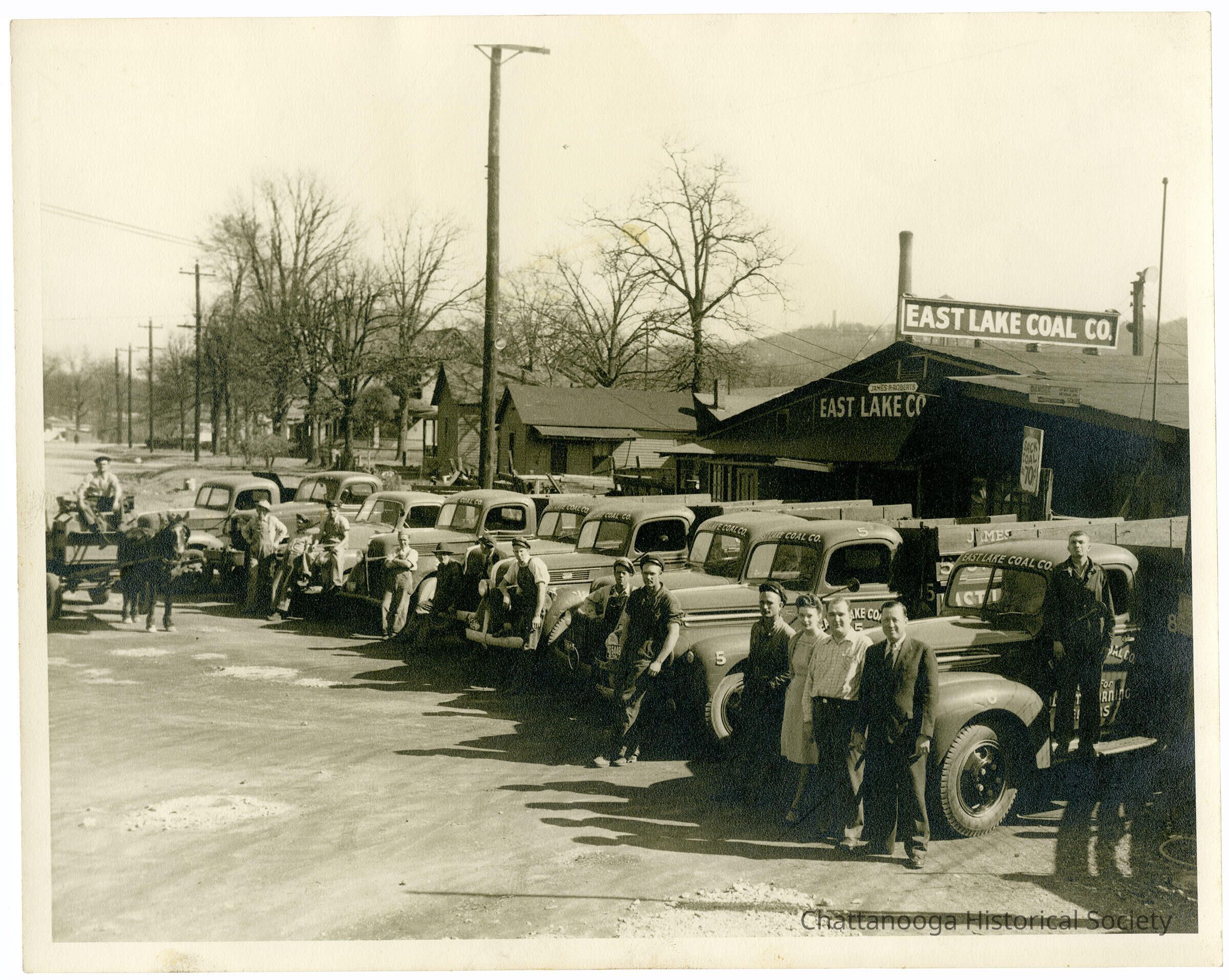 A photograph showing the employees and truck fleet of the East Lake Coal Company. Located at 3508 Seventh Avenue. Missionary Ridge visible in the background.
