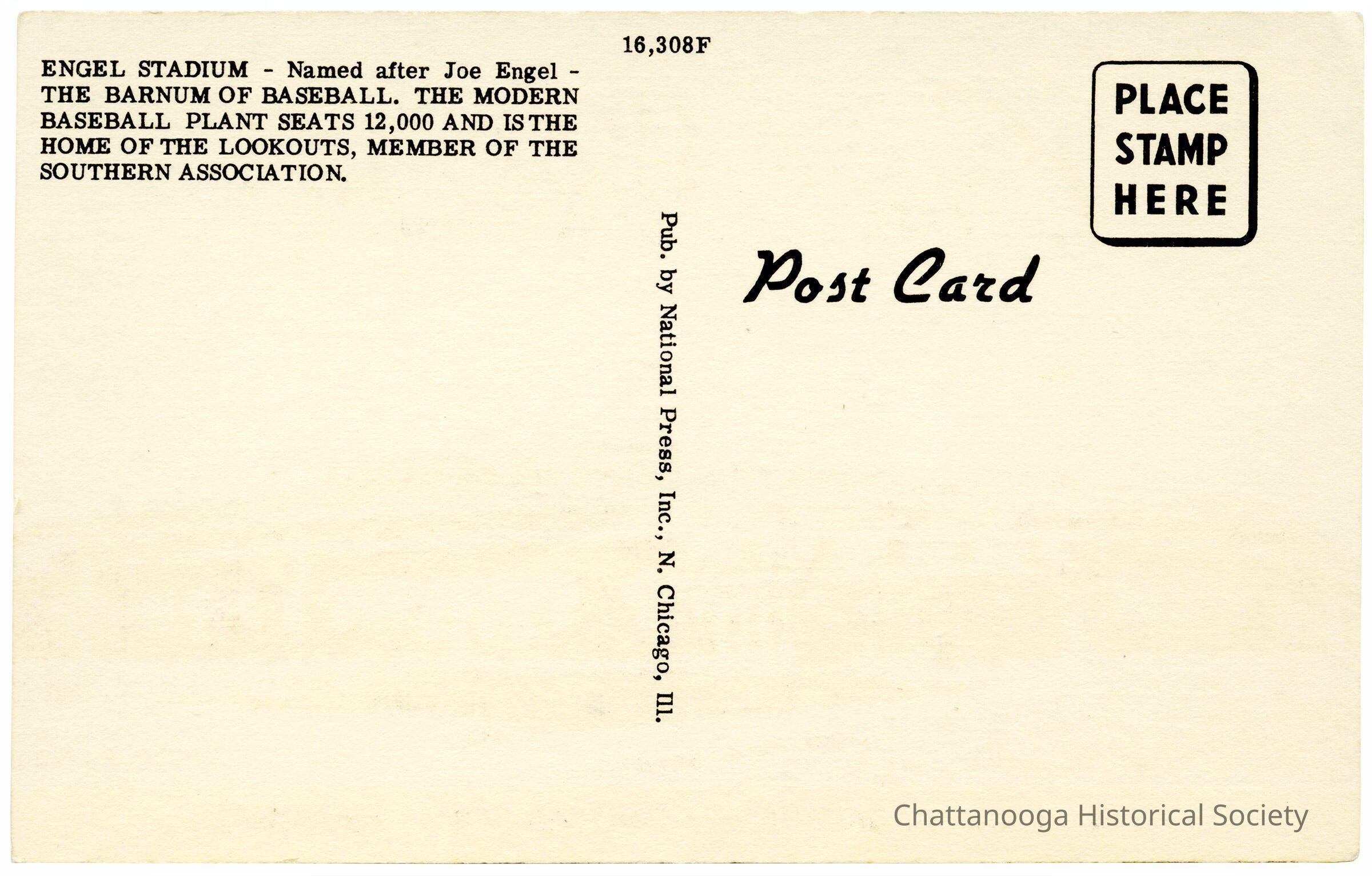 Reverse reads "ENGEL STADIUM - Named after Joe Engel -THE BARNUM OF BASEBALL. THE MODERN BASEBALL PLANT SEATS 12,000 AND IS THE HOME OF THE LOOKOUTS, MEMBER OF THE SOUTHERN ASSOCIATION."Subject