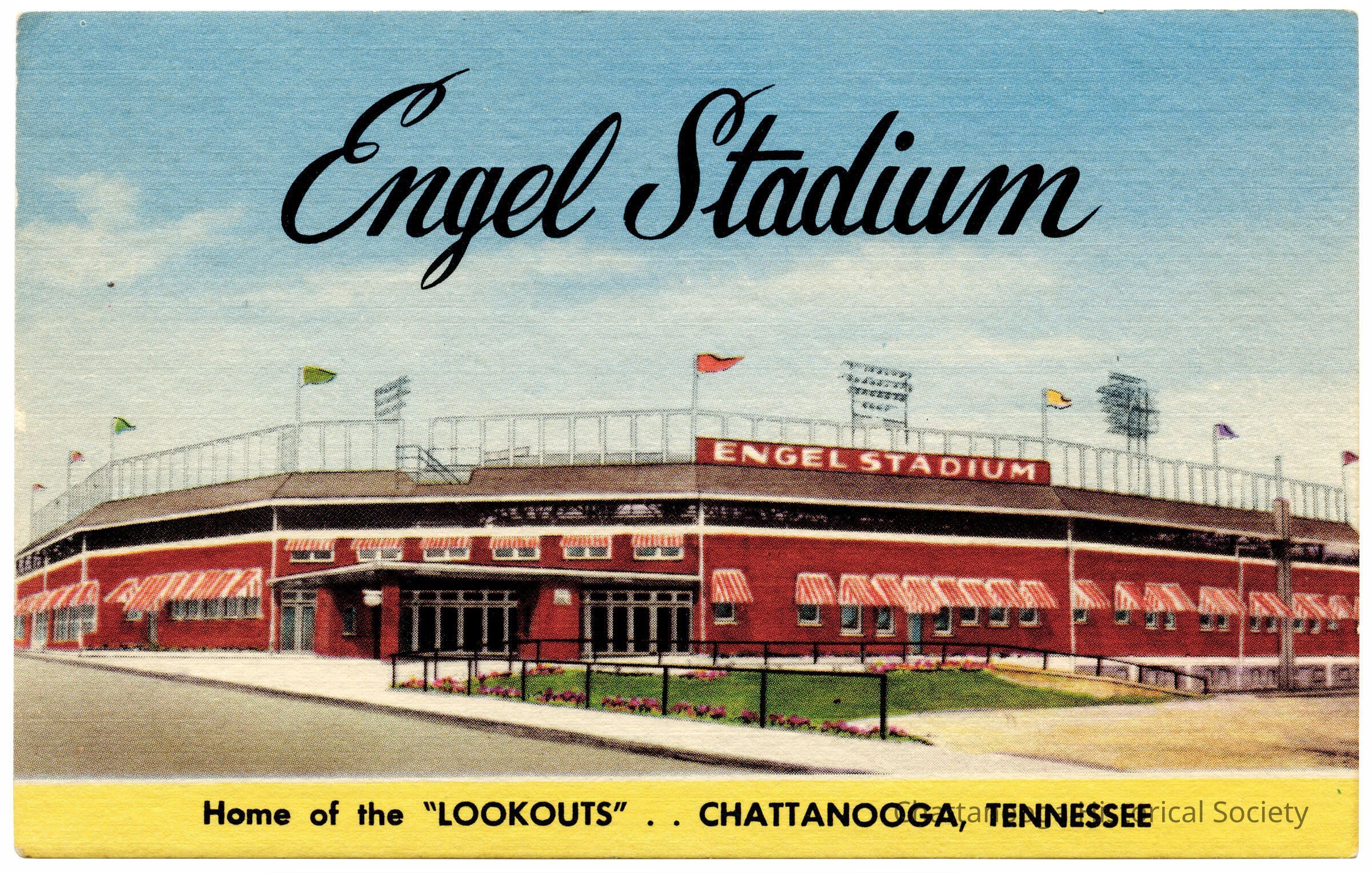 A postcard with the front showing an illustration of Engel Stadium, the home field of the Lookouts baseball team, in Chattanooga, Tennessee. Front reads "Home of the 'LOOKOUTS'..CHATTANOOGA, TENNESSEE"