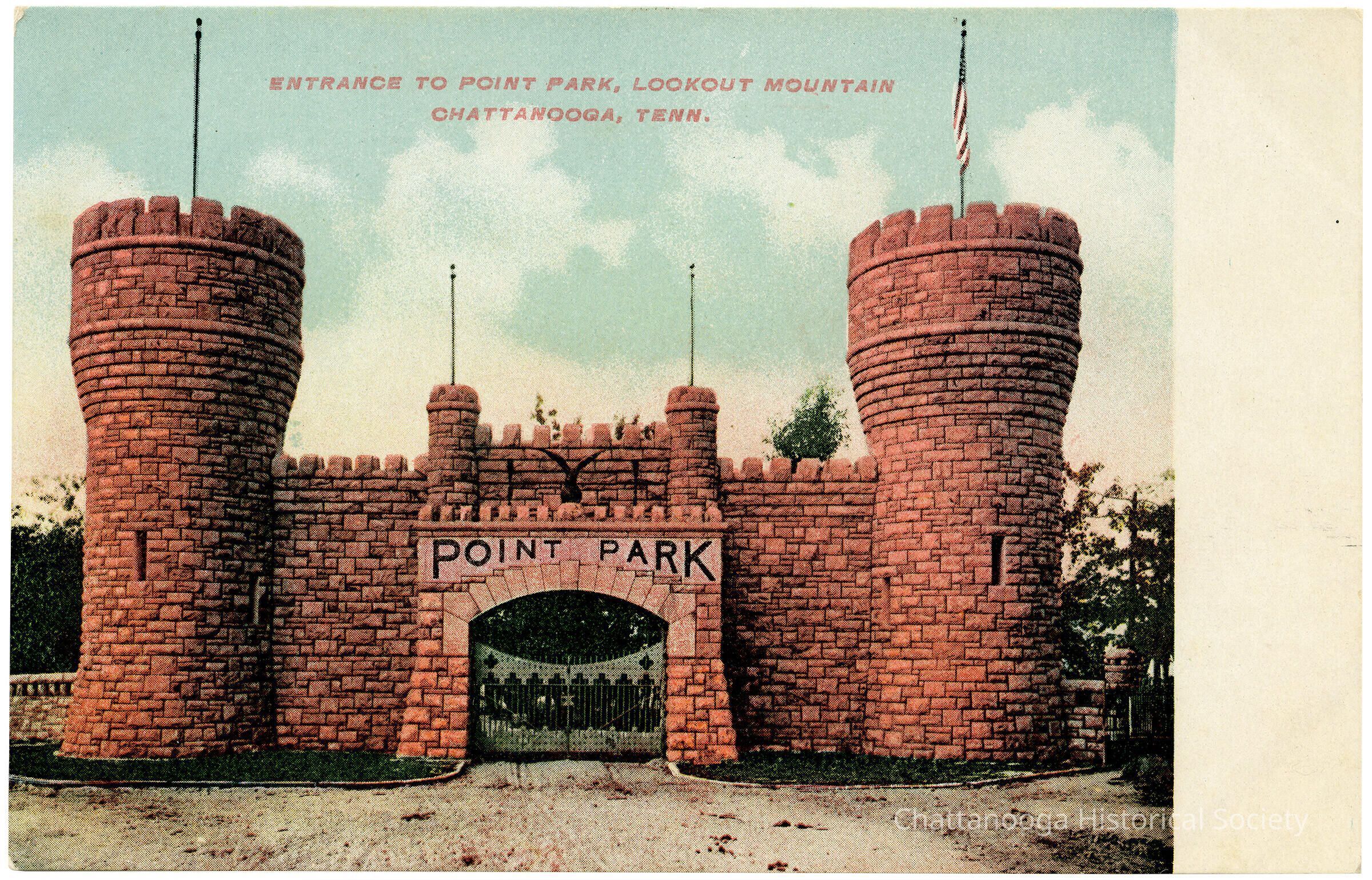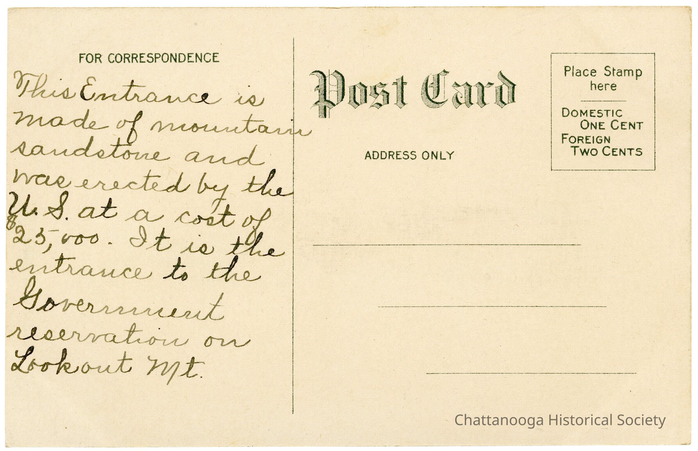 A postcard with the front showing an illustration of the entrance to Point Park atop Lookout Mountain, Tennessee.Subject Place