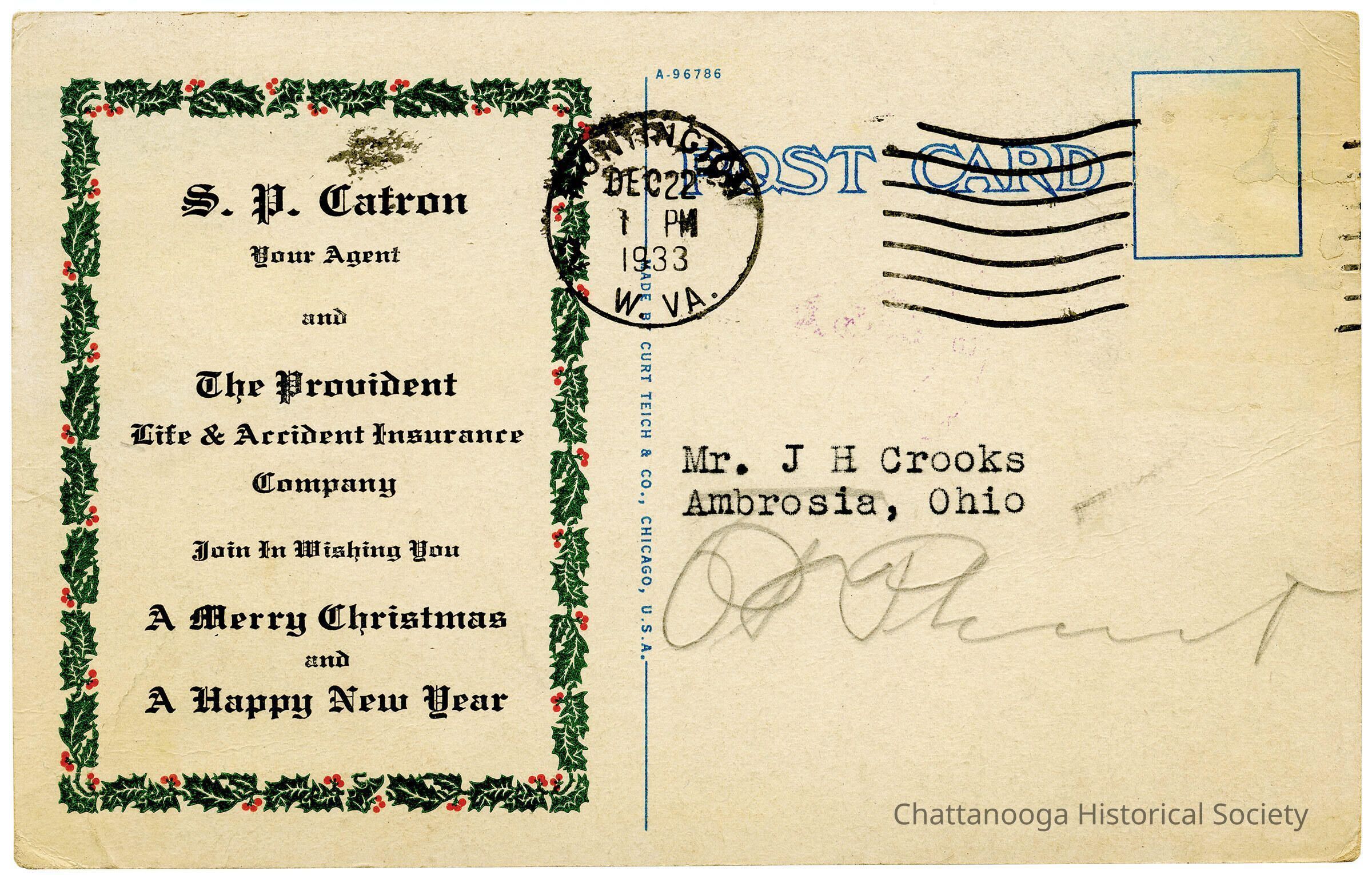 The back features a message from insurance agent S.P. Patton that reads "S.P. Cantron, Your Agent and THe Provident Life Insurance Company Join in Wishing You A Merry Christmas and A Happy New Year." The message is surrounded by a holly and berry frame.Subject