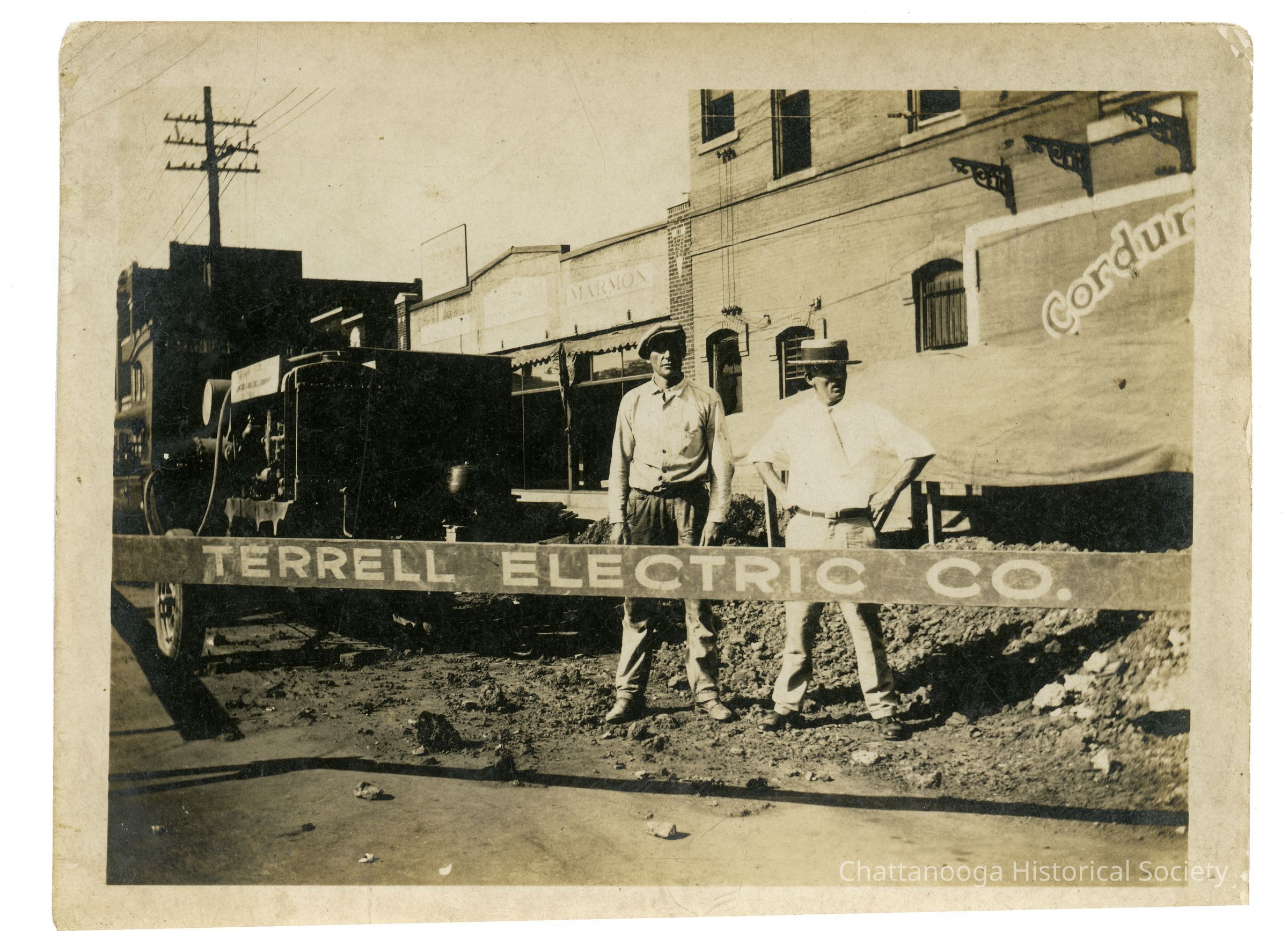 Black and white photograph of two men standing amidst rubble on Broad Street, in front of a large sawhorse with "Terrell Electric Co." painted on it. An awning to their left, rear covers the work being one on the sidewalks. A truck on their right appears to have a generator on the bed. Buildings with painted signs can be seen in the background, including the Corduroy Cords sign and Marmon (likely Nordyke & Marmon". "1927" is written in pencil on the recto.Photograph Details