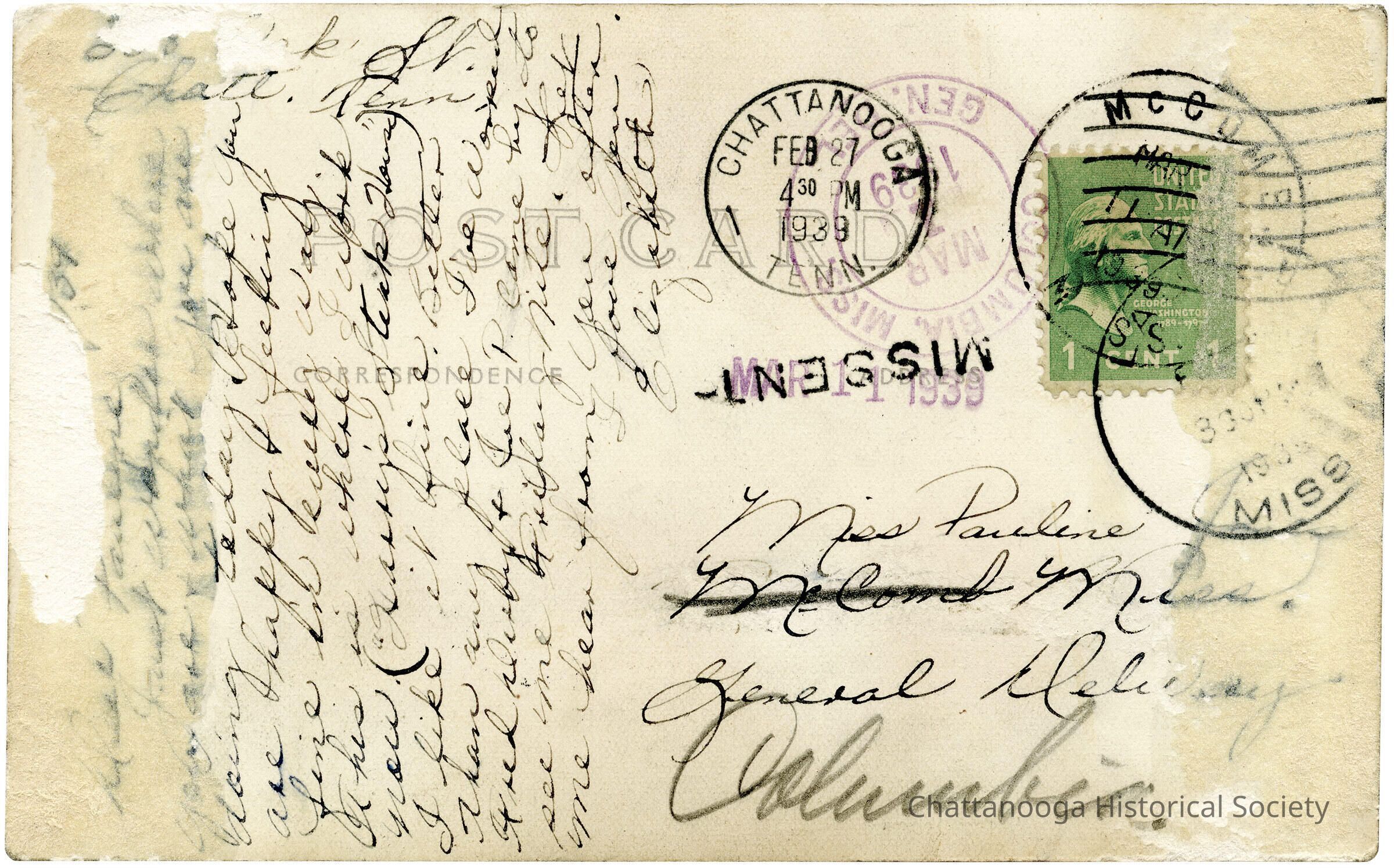 The postcard was originally addressed to McComb, Mississippi but was redirected to ColumbiaRelationships