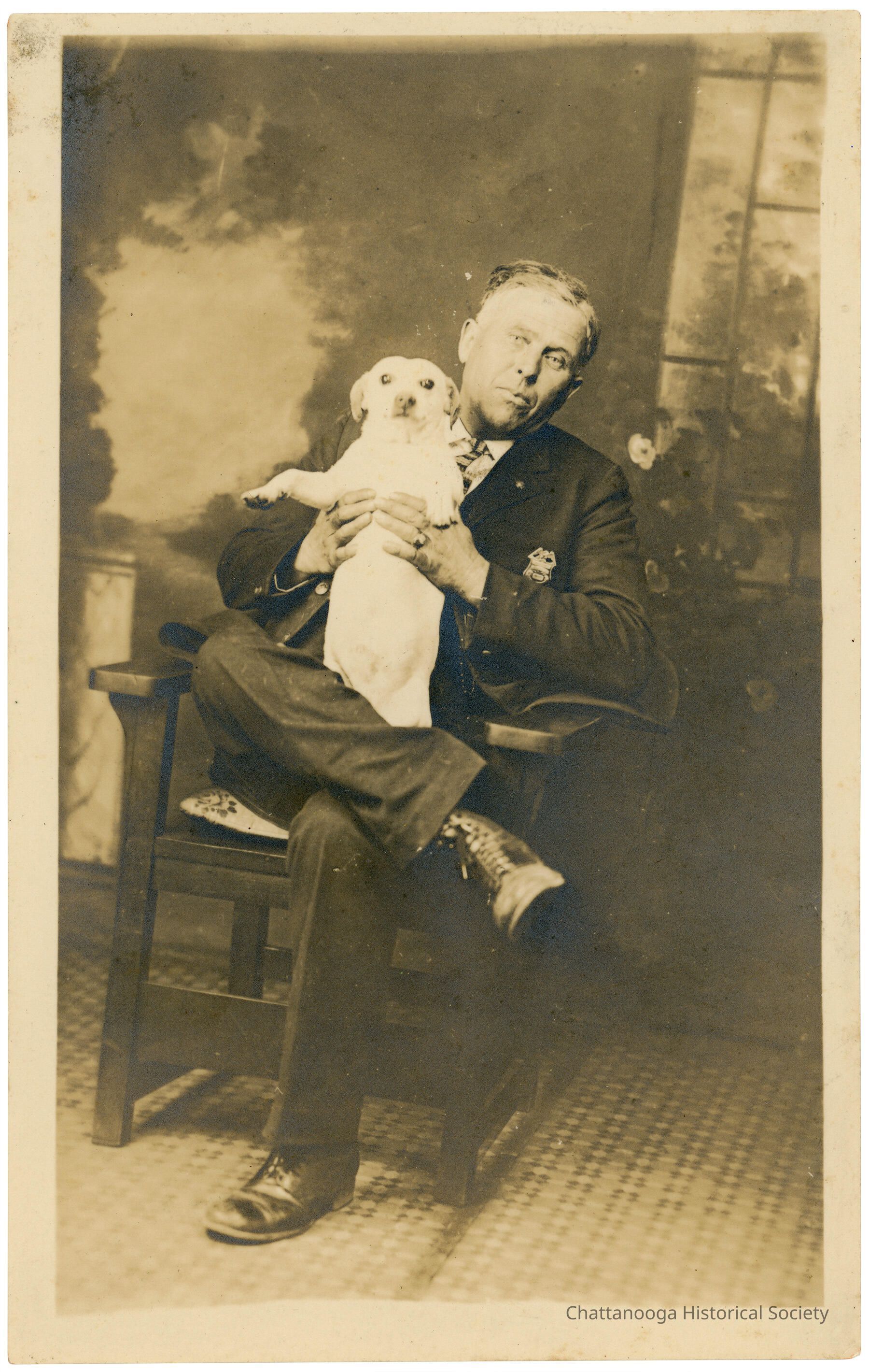 Black and white photograph of a man sitting for a studio portrait with his dog. The man is wearing a dark suit with a white shirt and tie. There is a badge on his shirt pocket that appears to be a silver badge with a figural eagle on the top, possibly for the Chattanooga Police Department. His right leg is crossed over his left knee and he is holding a white dog in his lap. The two are seated in a wooden chair, in front of a studio backdrop to look like a room in a house with a trompe l'oeil. The rear is stamped "The photo made by Peoples Studio 10 E. Ninth St., Chattanooga, Tenn."Photograph Details