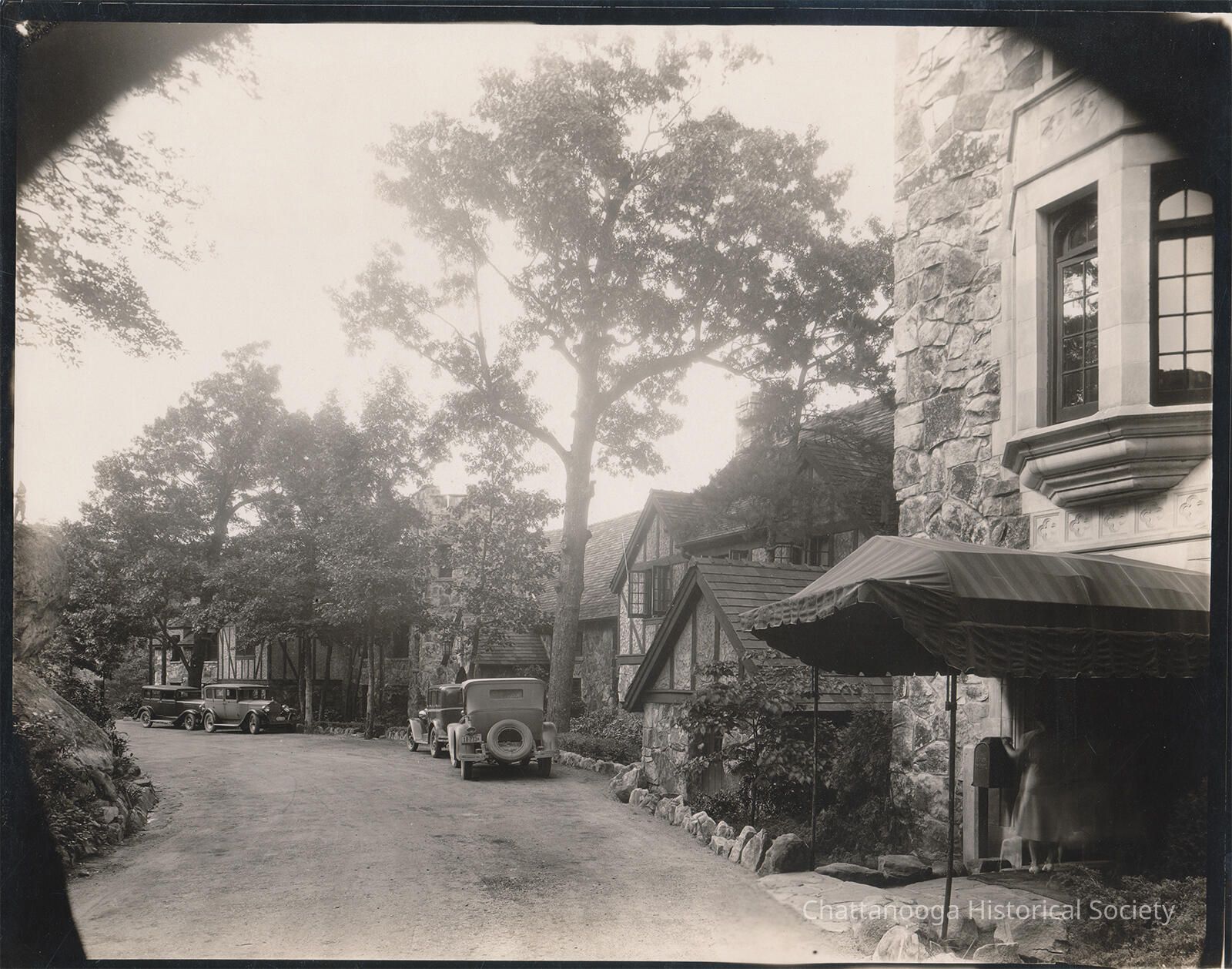 Black and white photograph of the front façade and entryway to the Fairyland Inn (later the Fairyland Club building). The Tudor Revival style club and hotel was established by Garnet and Frieda Carter in 1926. The photograph shows the main entrance to the club with a covered awning over the entry way. A stone bay window with gothic details sits above the covered entry and a woman can be seen below. The main tower is built with local mountain stone. The hotel wing seen projecting from the main tower features stucco and half-timbering. There are four automobiles parked along the drive that fronts the club.
