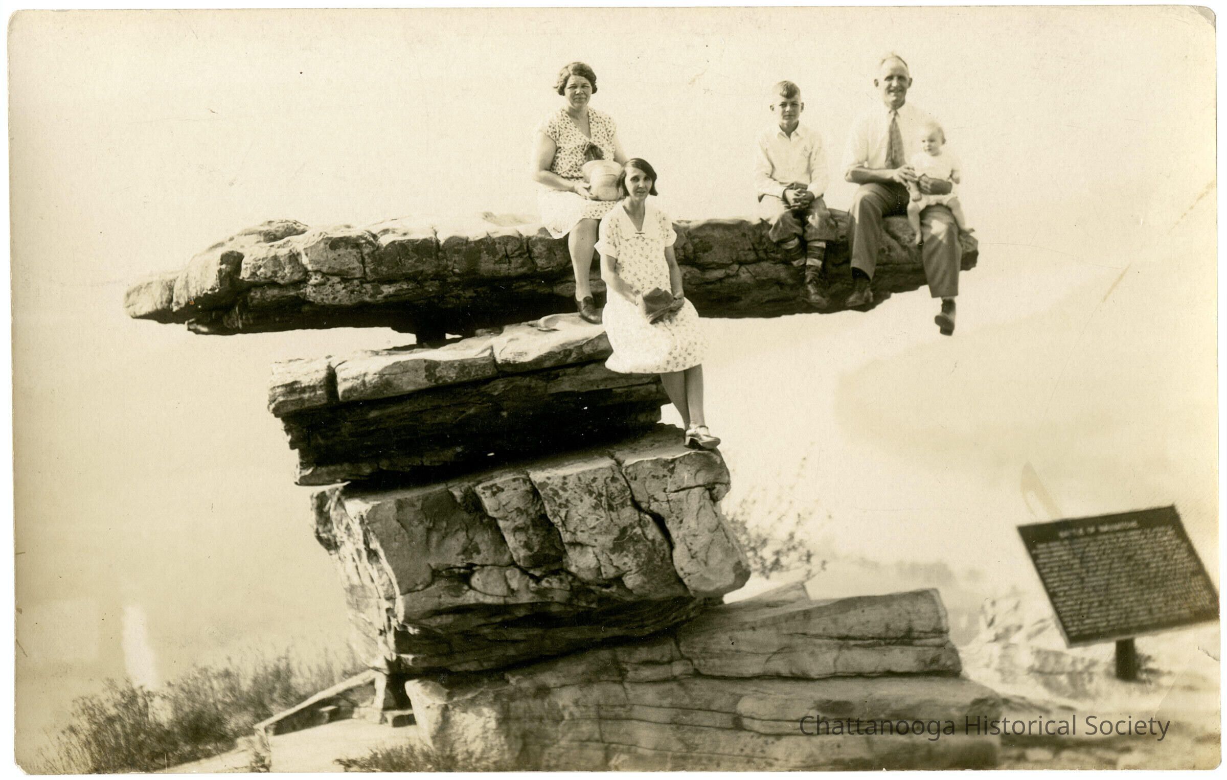 A postcard with the front showing a man, a young boy, two women, and a baby on Umbrella Rock. The sign at the bottom left describes The Battle of Wauhatchie that took place in the valley below.